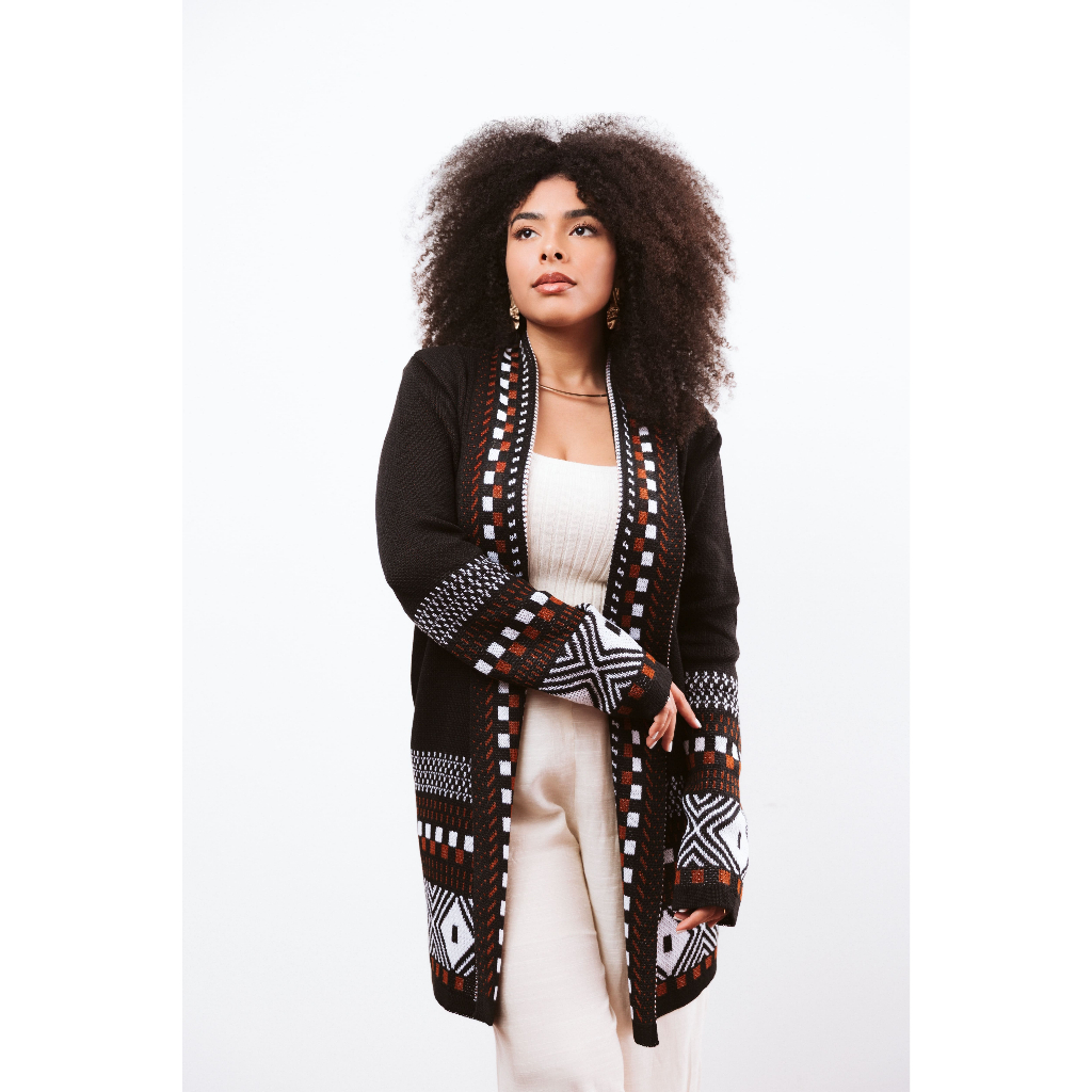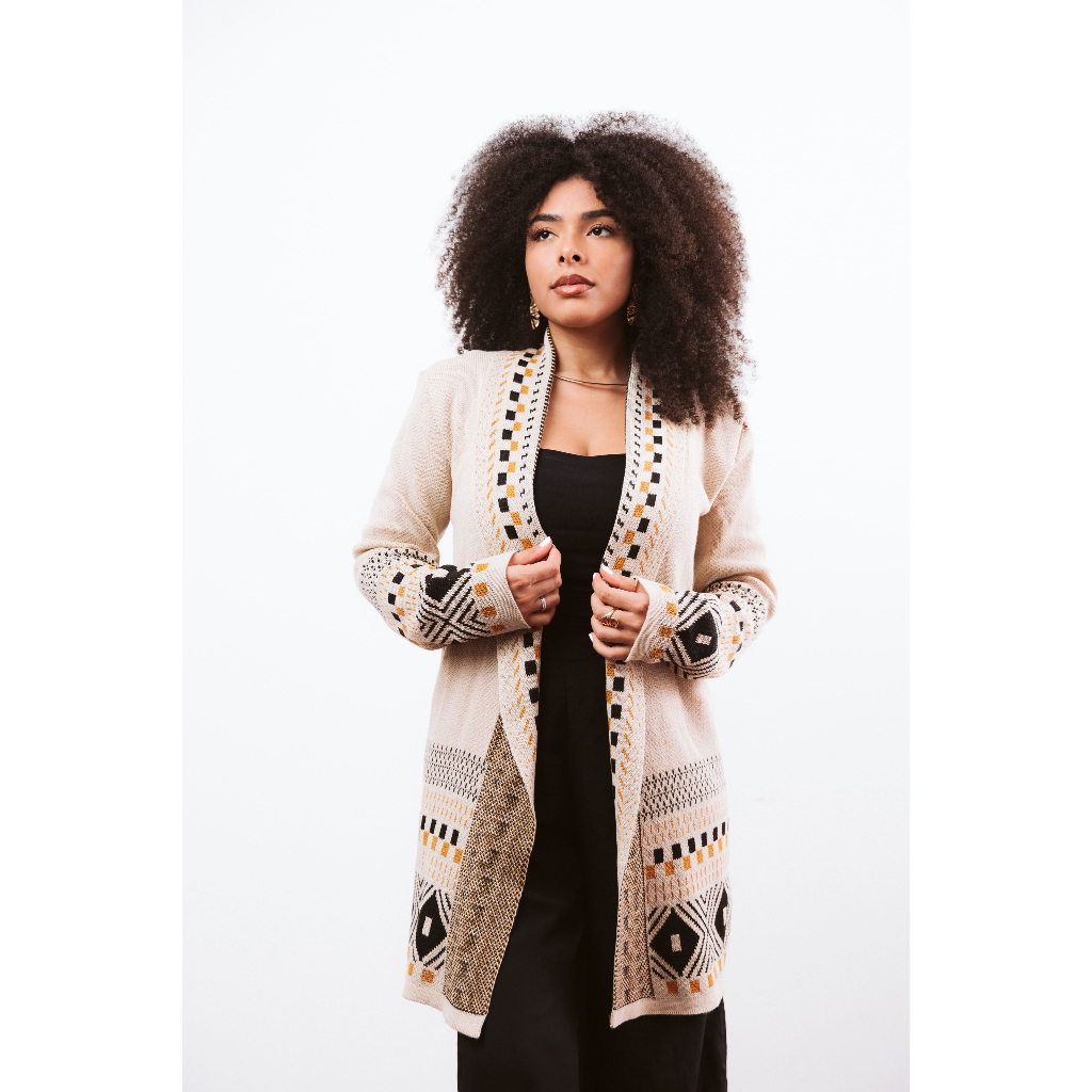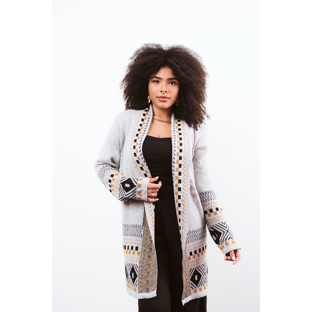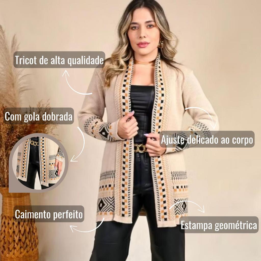 Cardigan Kimono Feminino Tricot Detalhes Geométricos Inverno Elegante Cardigã Tricô