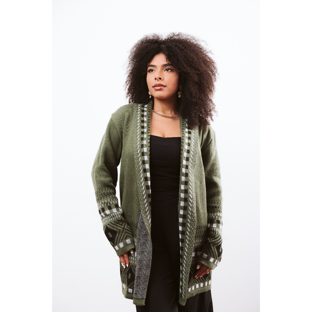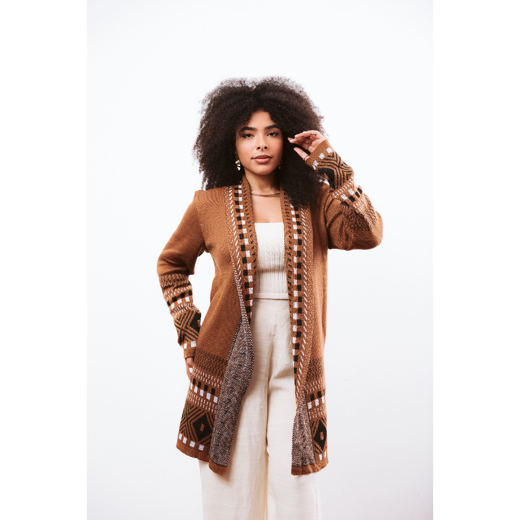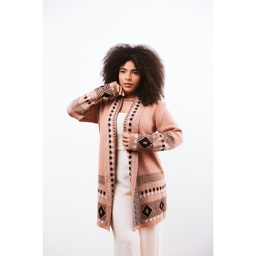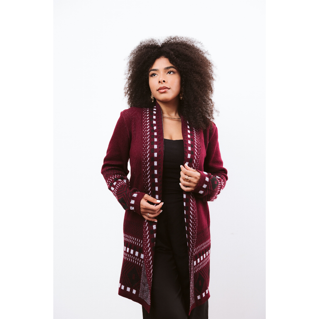Cardigan Kimono Feminino Tricot Detalhes Geométricos Inverno Elegante Cardigã Tricô