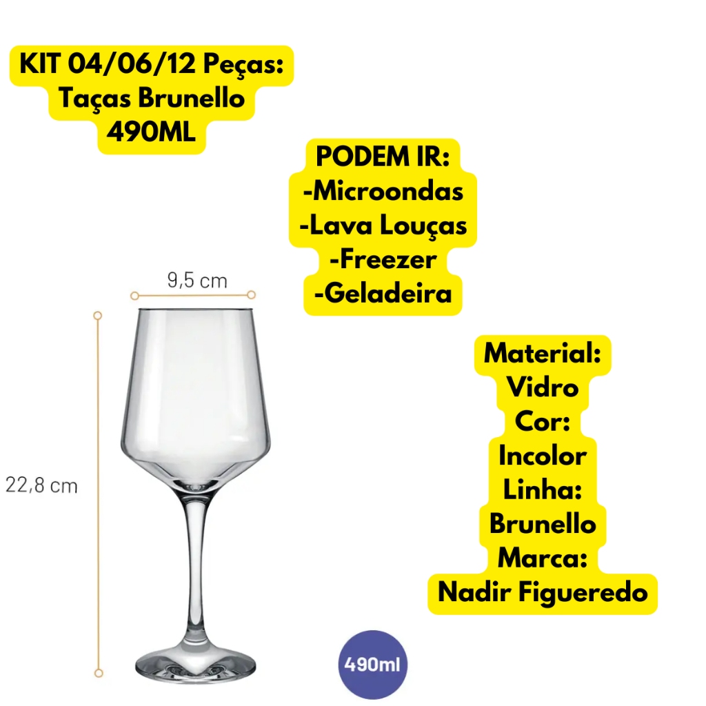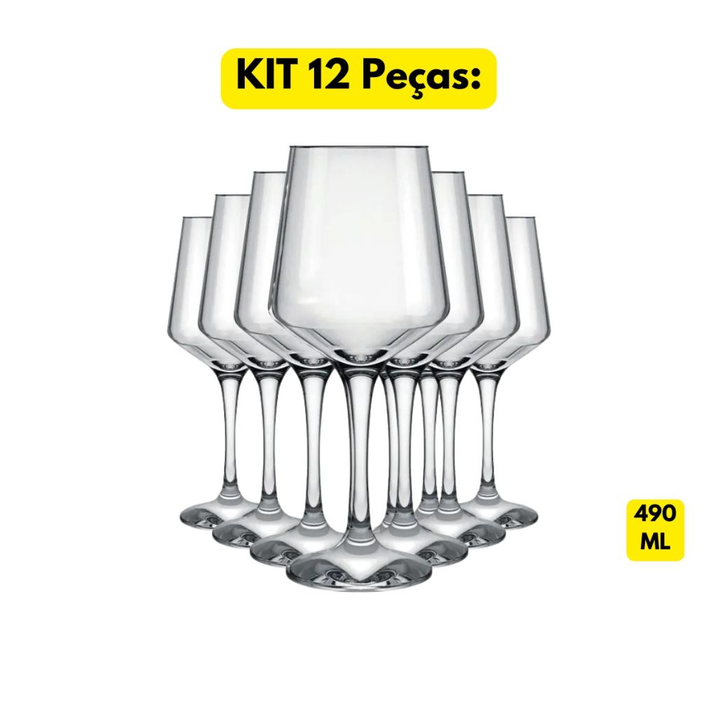 Jogo Kit 04/06/12 Taças Vidro Cristalino Brunello 490ML Vinho Água Tinto Suave Grande Buffet Hotel