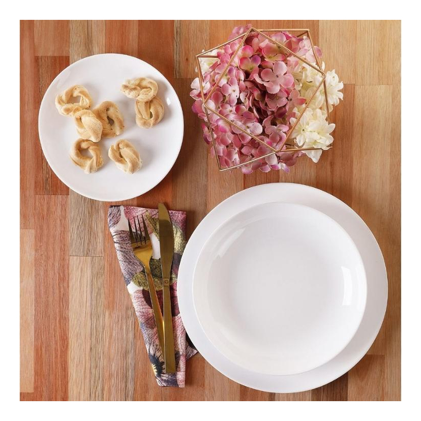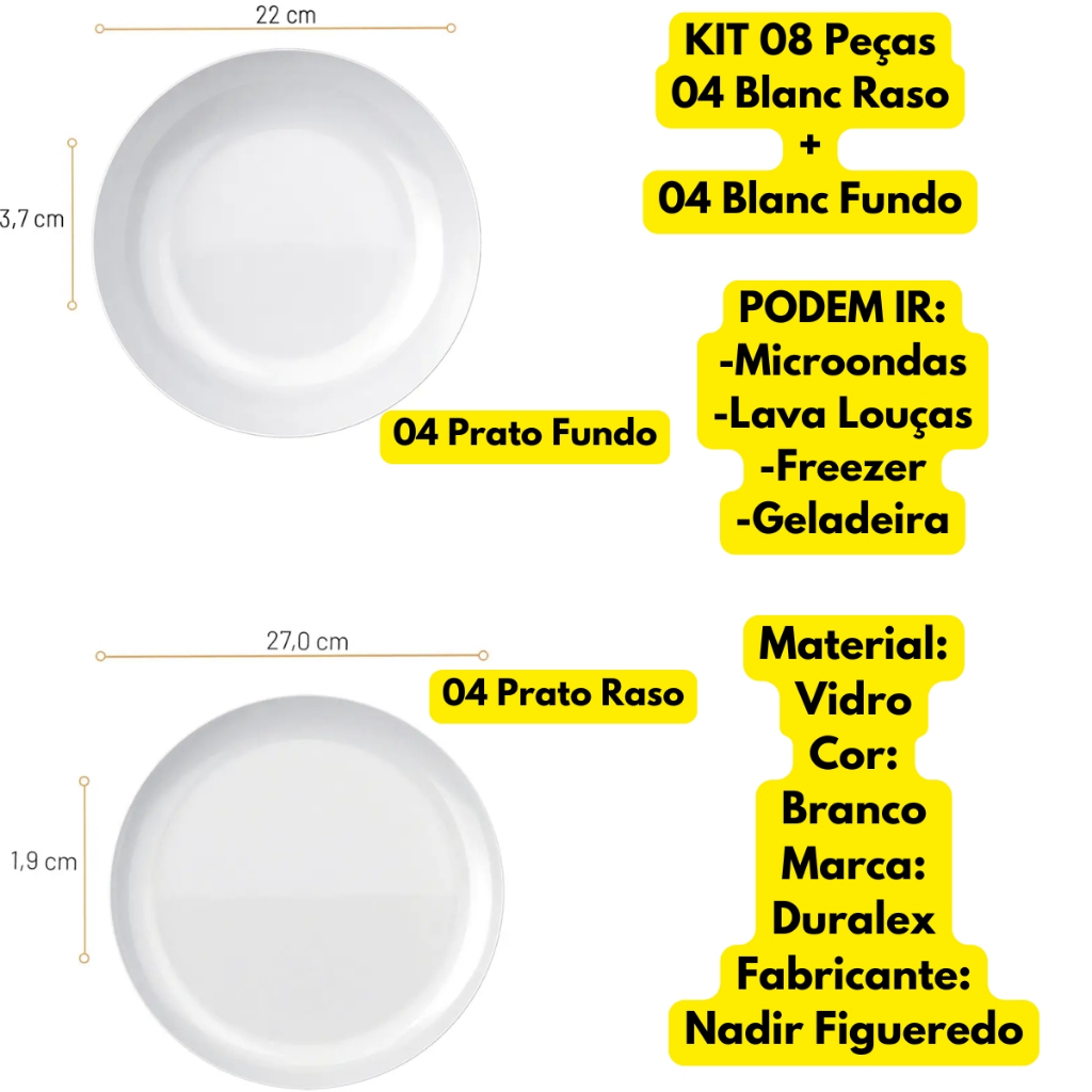 Jogo Kit 8 Pratos 04 Fundos + 04 Rasos Blanc Vidro Duralex Opaline Branco Redondo Jantar Almoço
