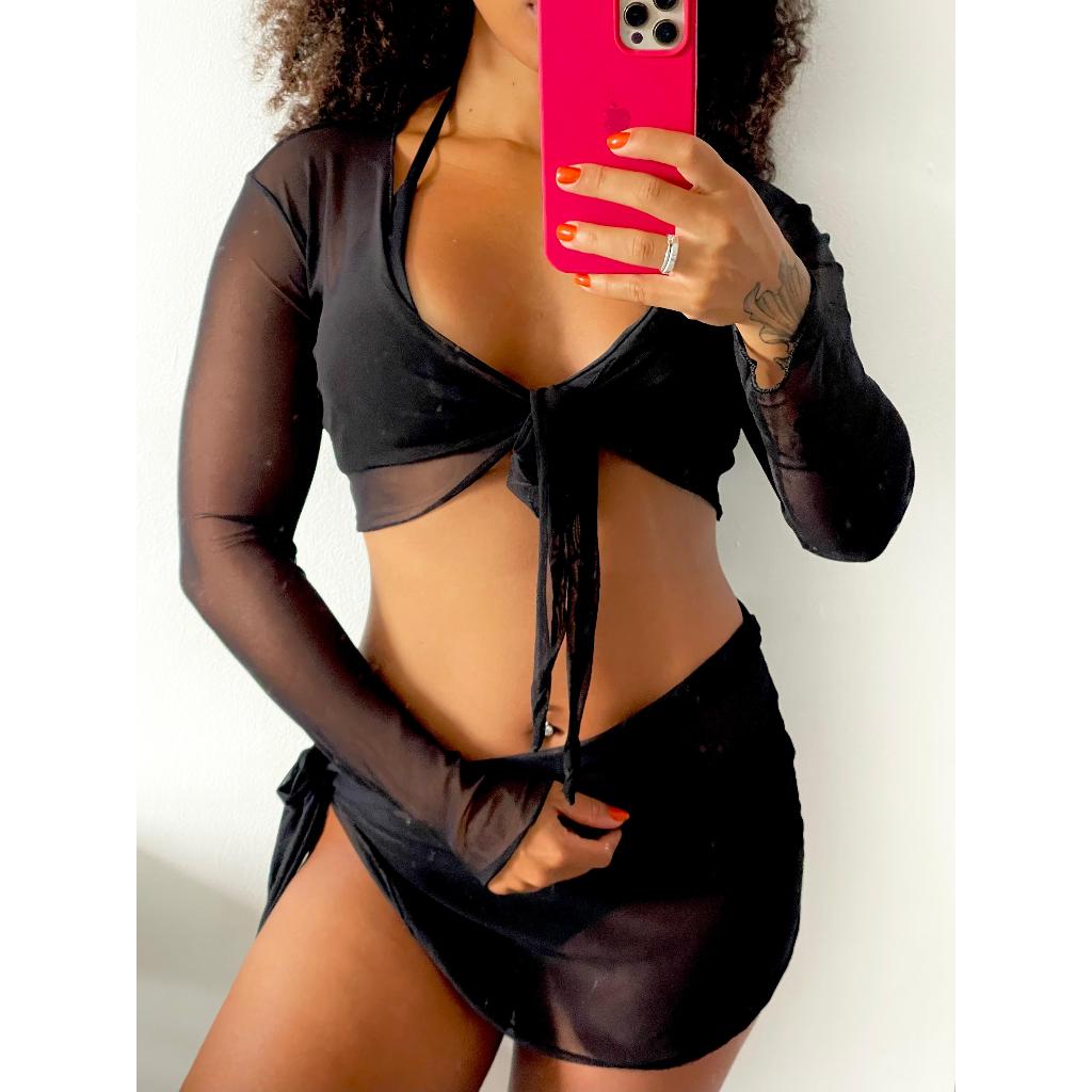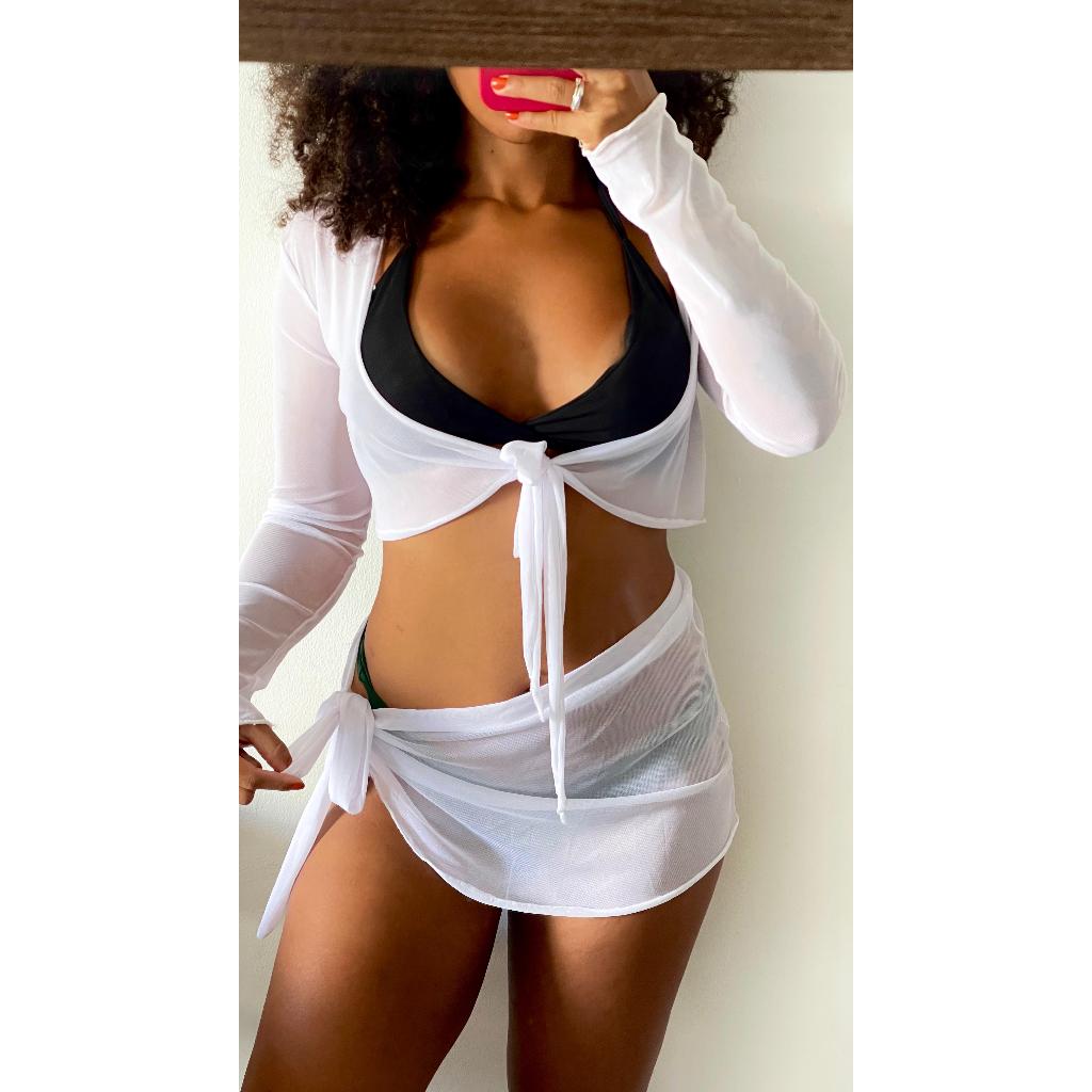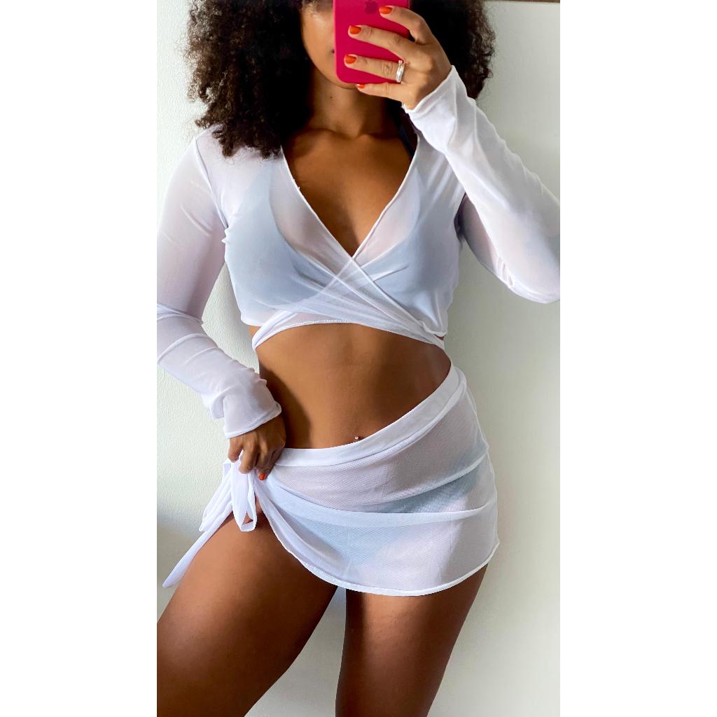 Saída de praia conjunto cropped e saia com amarrações em tule