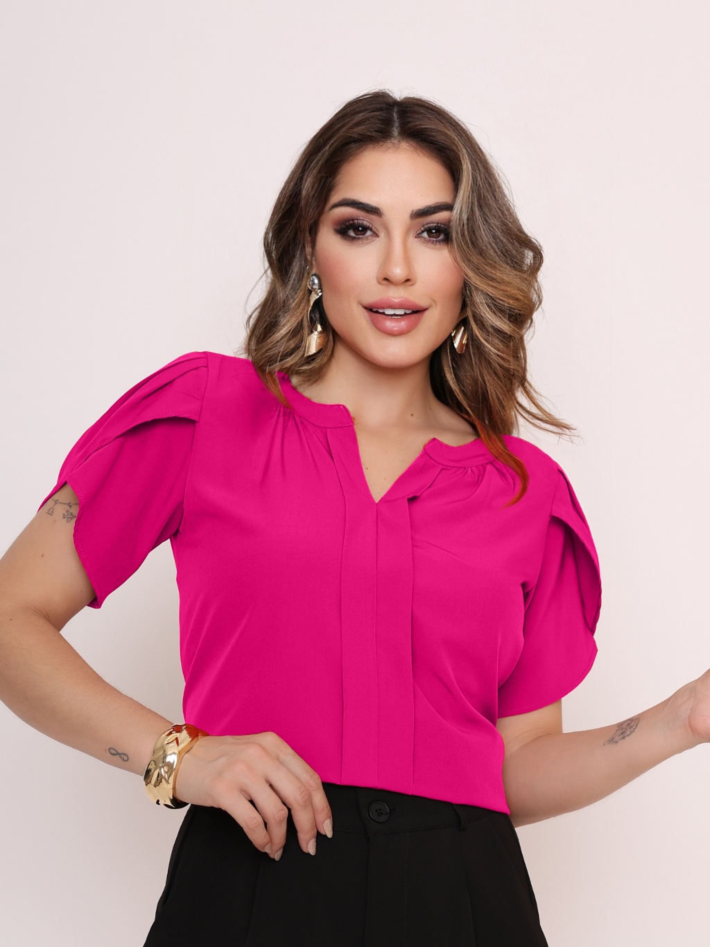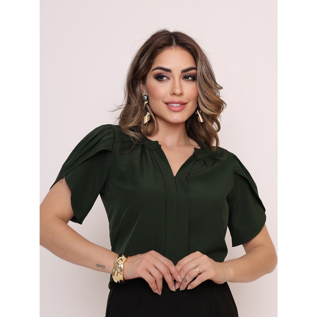 Novo Blusa Feminina cor sólida Pétala Manga Com Decote Em V Verão Design de decote requintado