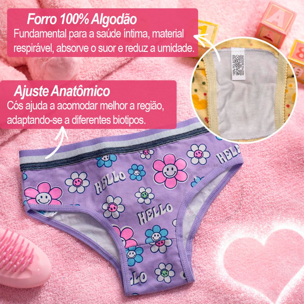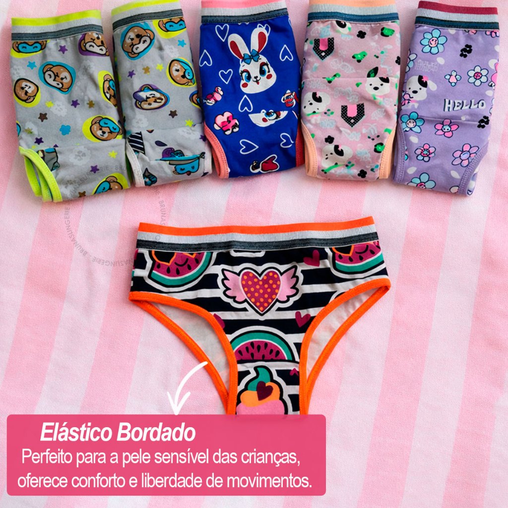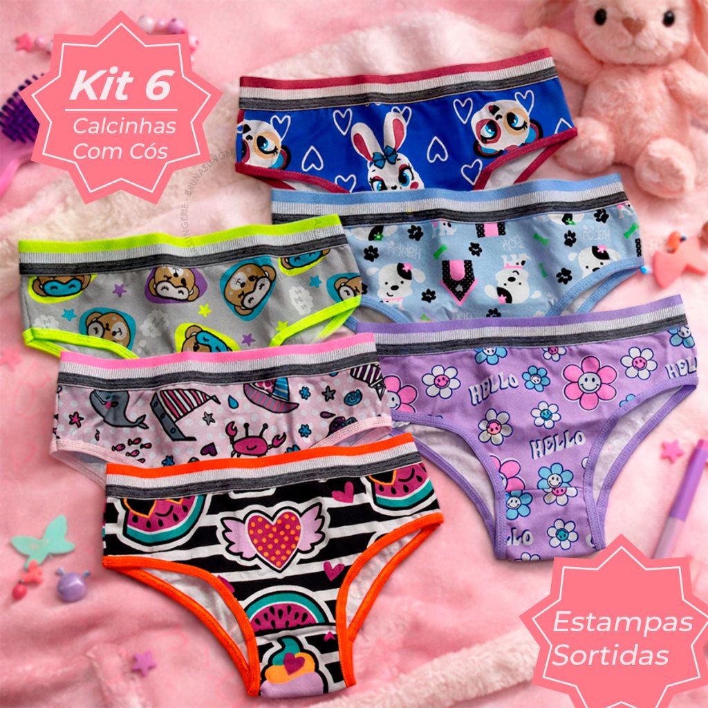 Kit 6 Calcinha Infantil Cós 100% Algodão 4 A 12 Anos Roupas Íntima Menina Estampas Sortidas