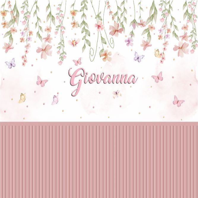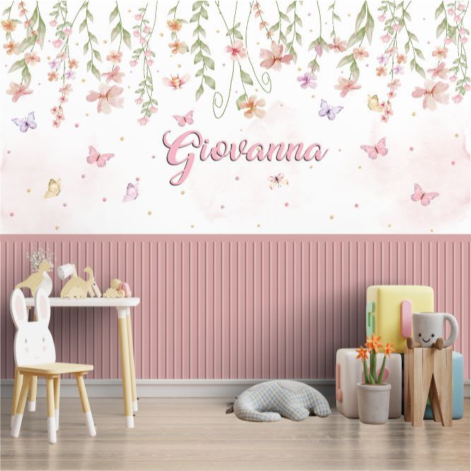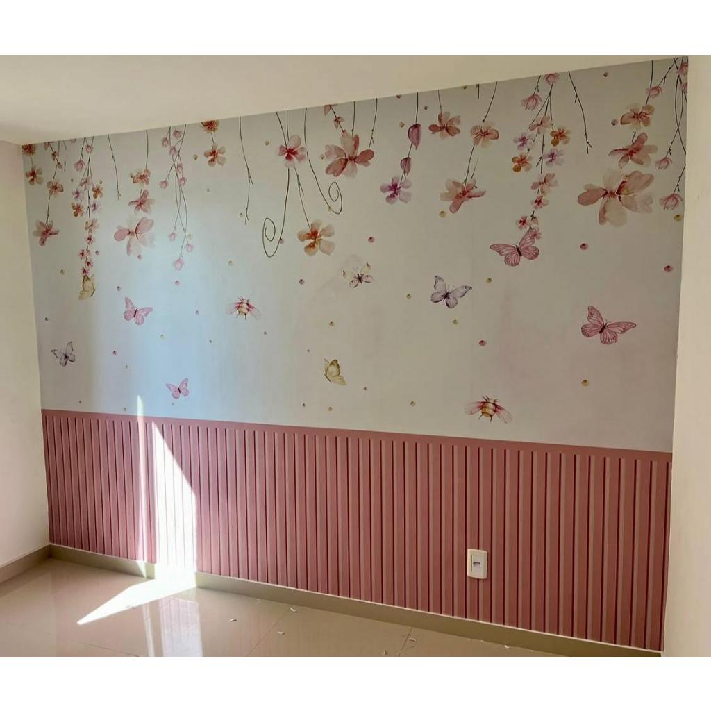 Papel de Parede Adesivo Jardim Encantado Com Ripado Rosa Painel Decoração Quarto Menina