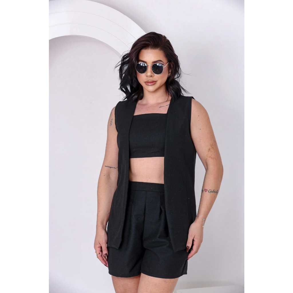 Conjunto feminino 3 peças linho P M G e GG colete+ cropped+ short