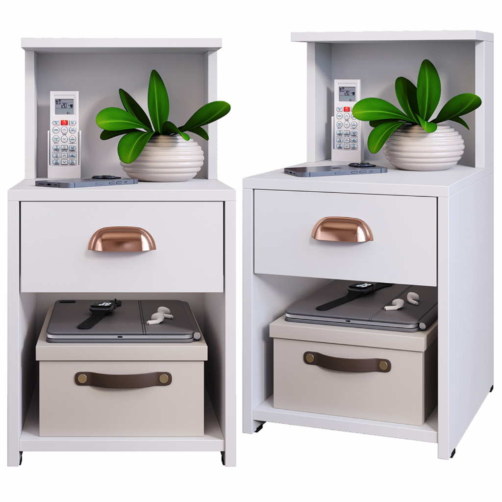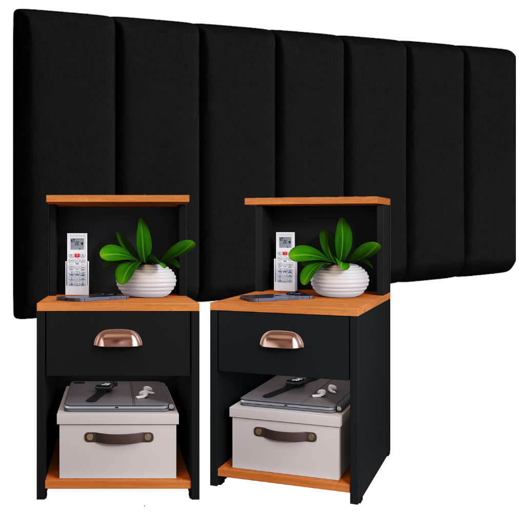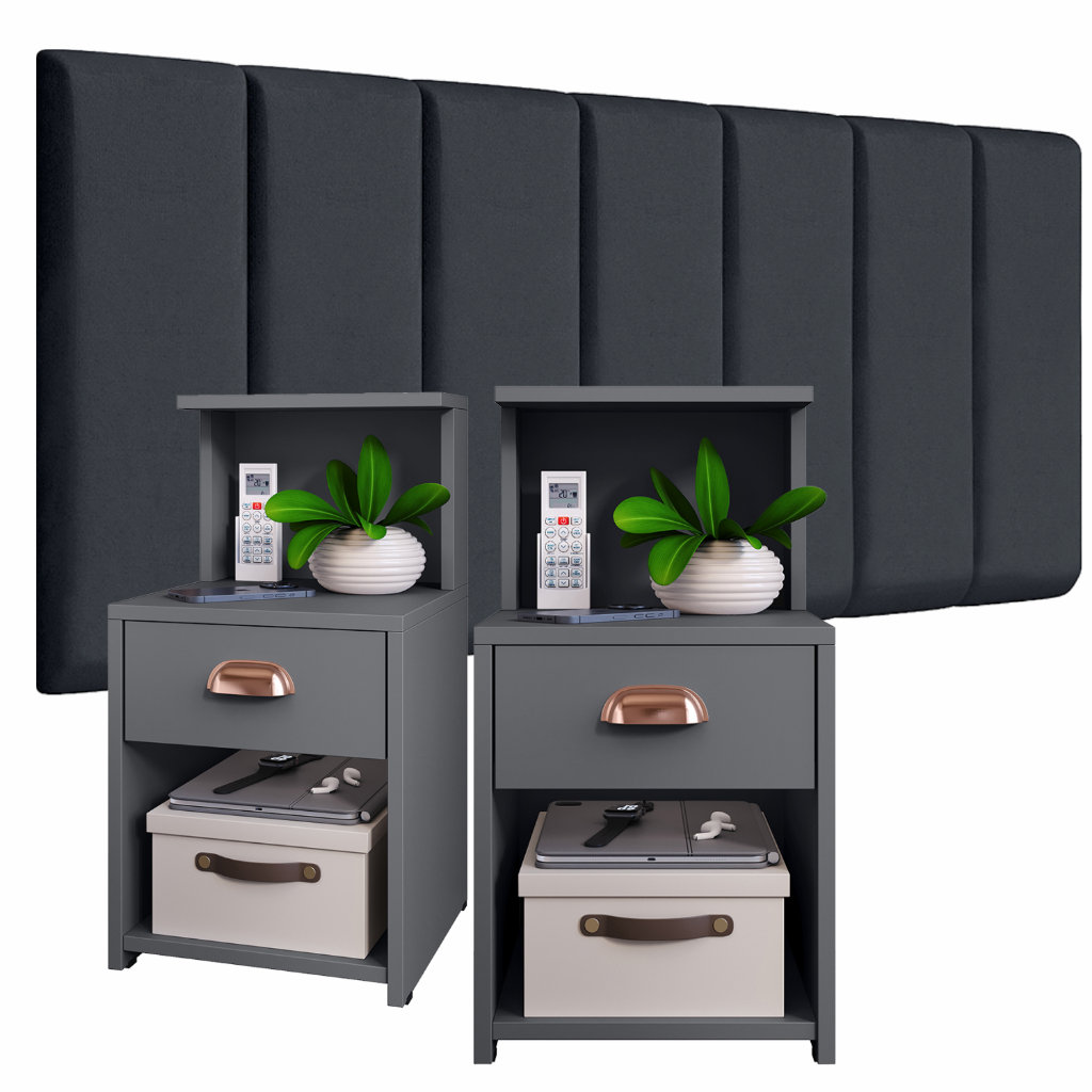 Conjunto Quarto Cabeceiras em Módulos Placas 45x20 + 2 UN de Mesa de Cabeceira CLÉO com Gaveta Nicho e Puxador Concha