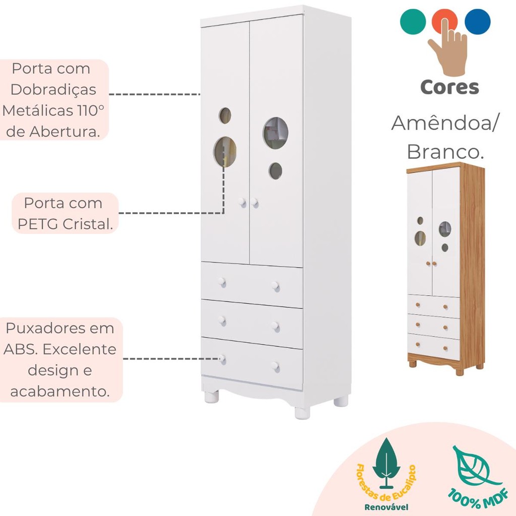 Guarda Roupa Infantil Bolinha 2 Portas 3 Gavetas 100% MDF