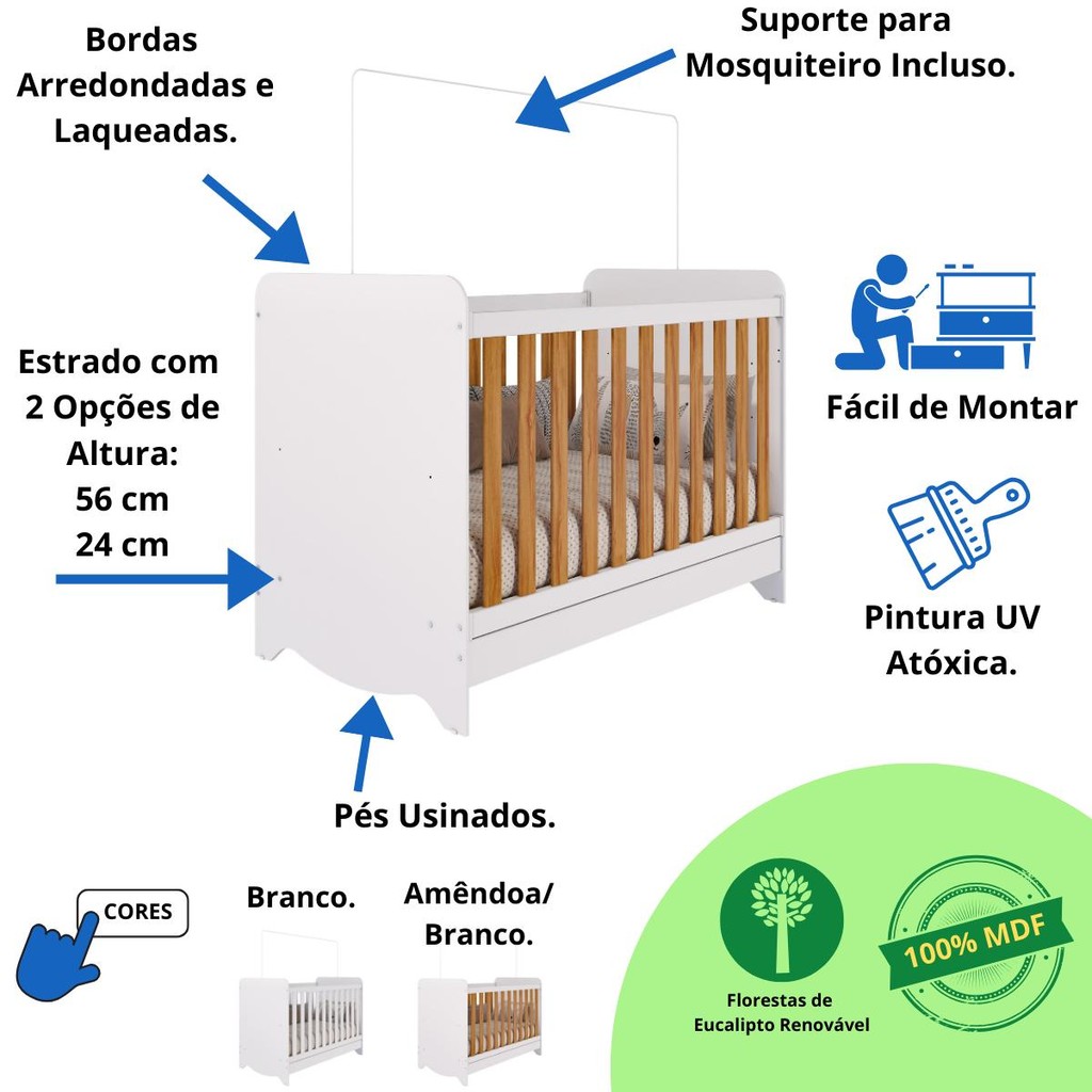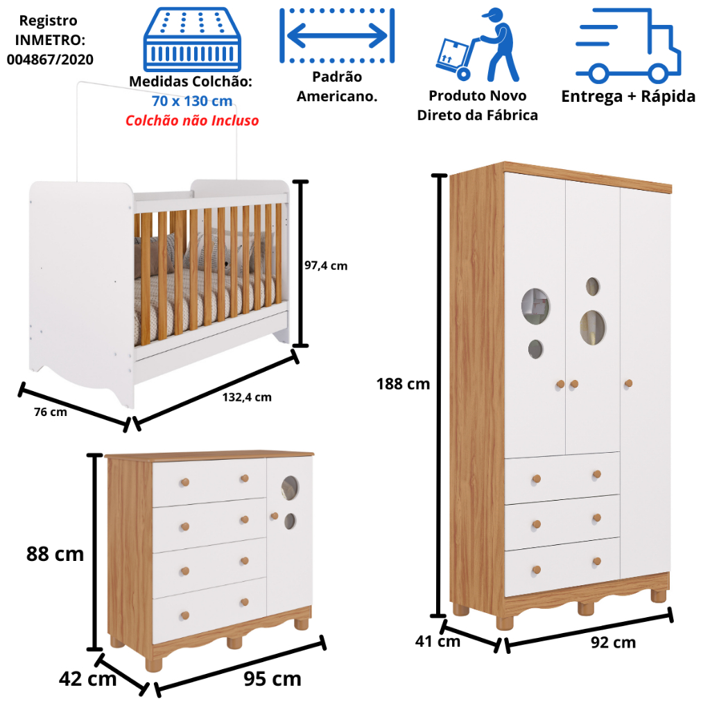 Quarto Bebê Completo Berço Americano Bem 3 em 1 Guarda Roupas 3 Portas Cômoda Bolinha 100% MDF