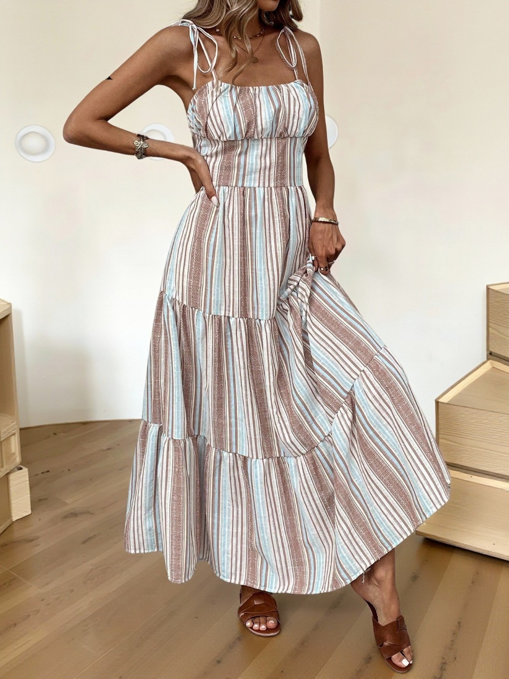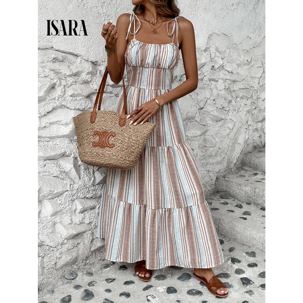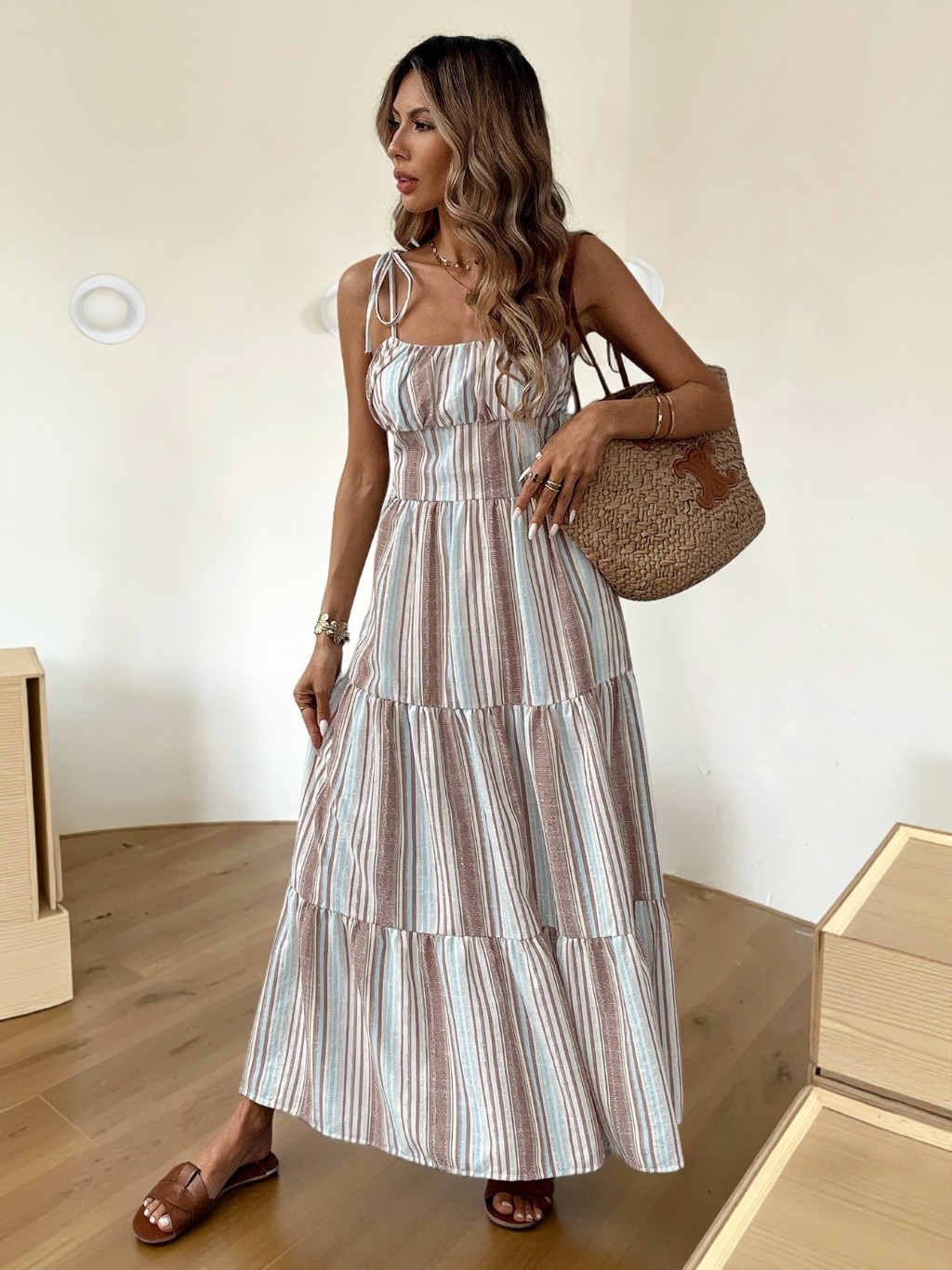 SV Vestido Feminino Verão Praia - Listrado Tirantes Maxi | Elegante para Primavera, Carnaval