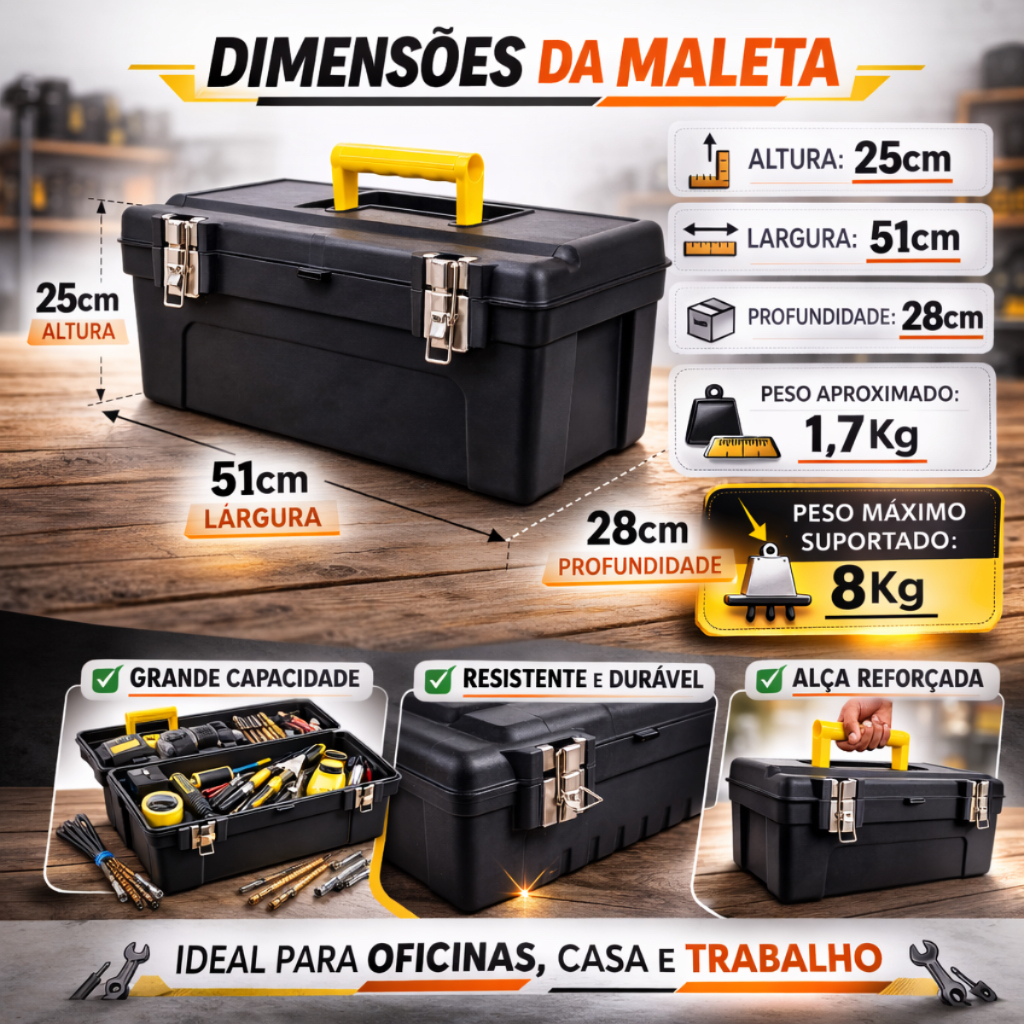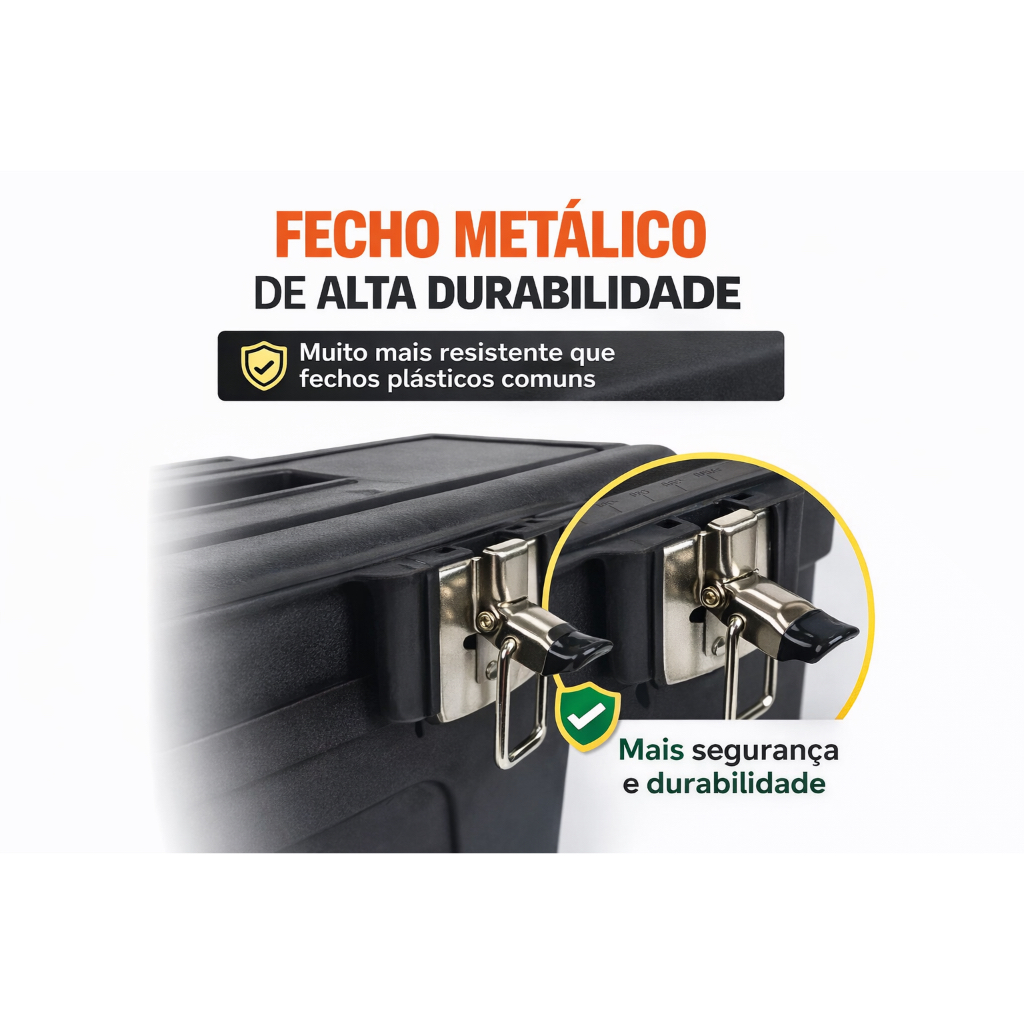 CAIXA DE FERRAMENTAS 19,5” PRETA COM FECHO METÁLICO E BANDEJA REMOVÍVEL – PROFISSIONAL RESISTENTE