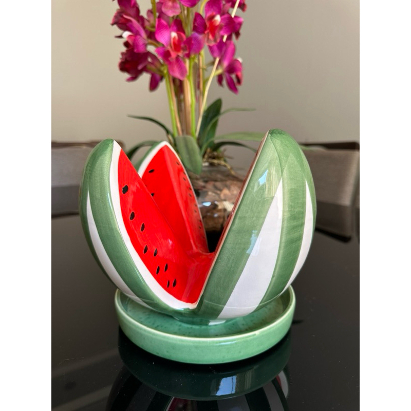 Centro de Mesa Enfeite Fruta Melancia com Suporte em Cerâmica Decoração