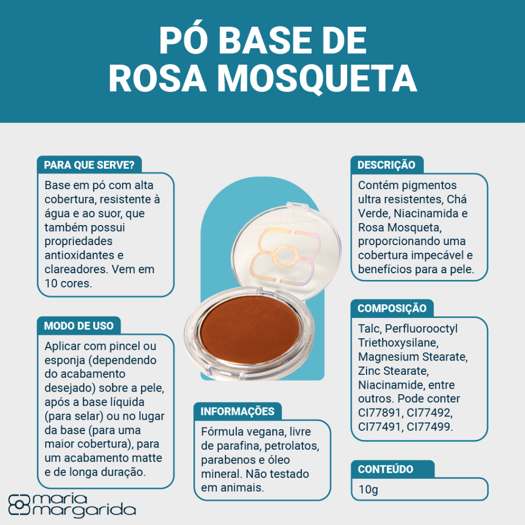 Pó Base de Rosa Mosqueta Compacto Altíssima Cobertura Até Embaixo D´água - Maria Margarida