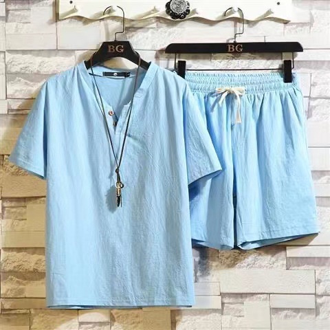 Algodão E Linho Manga Curta shorts Terno Masculino Estilo Camiseta De Pescoço Em VModa Verão casual Esportivo Conjunto