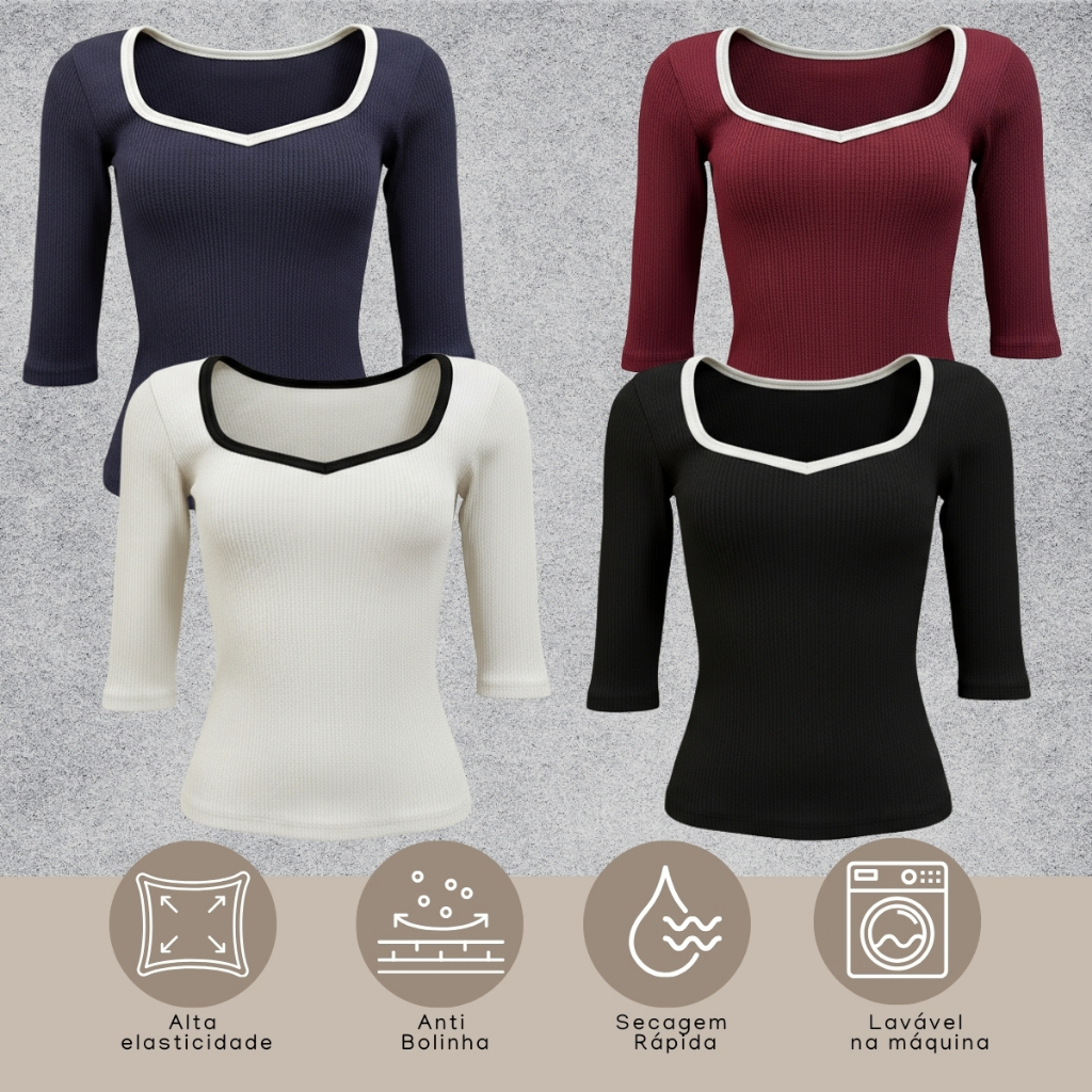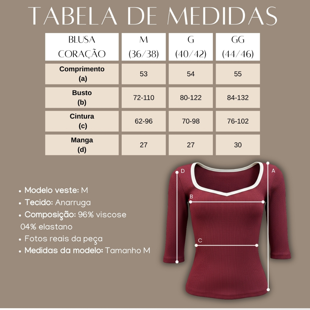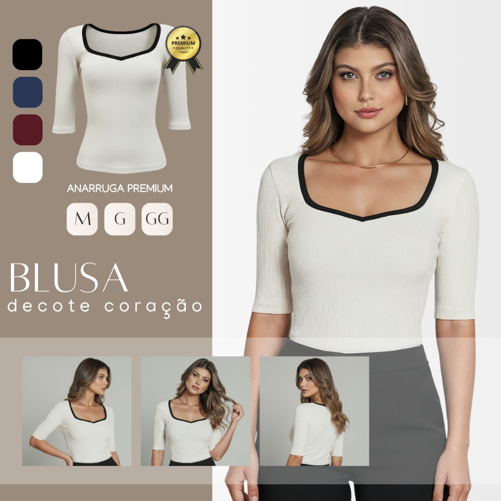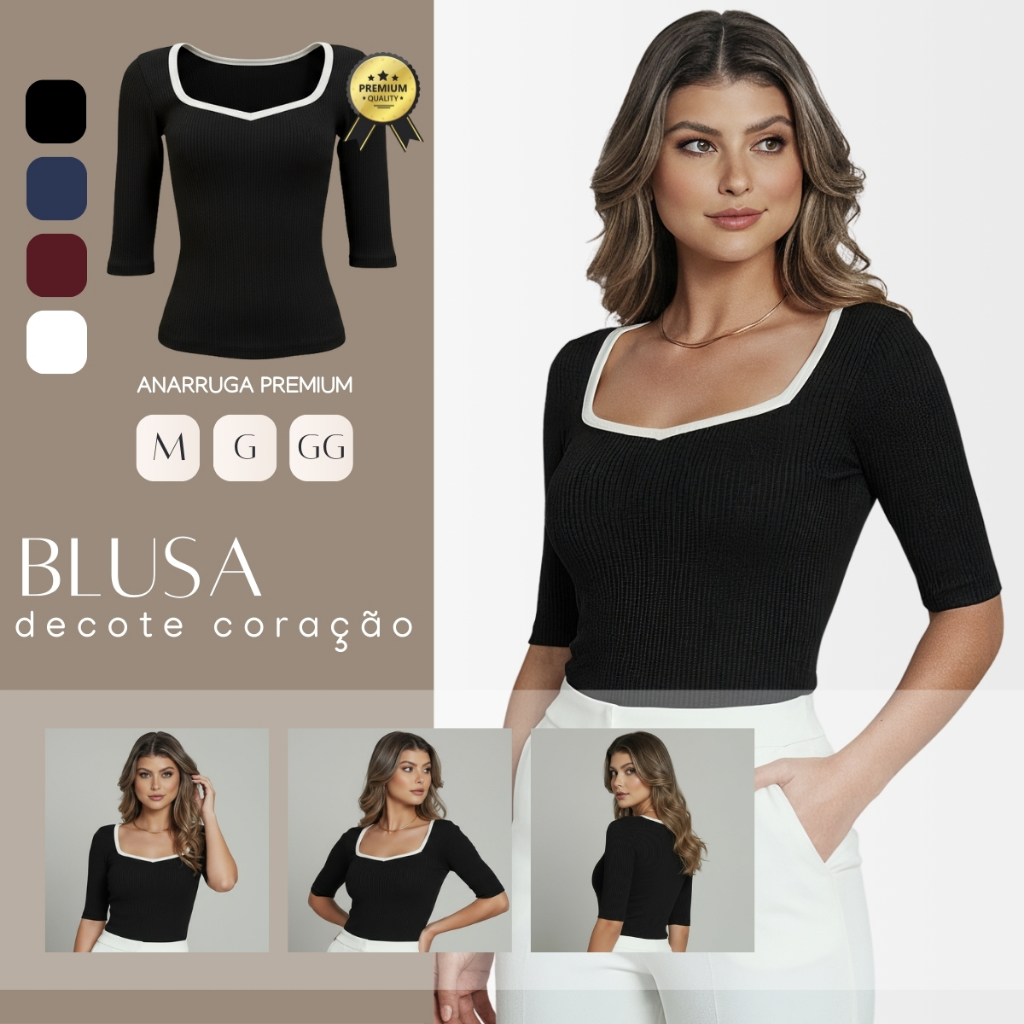 Blusa Feminina Decote Coração Manga 3/4 Tecido Anarruga Premium M ao GG