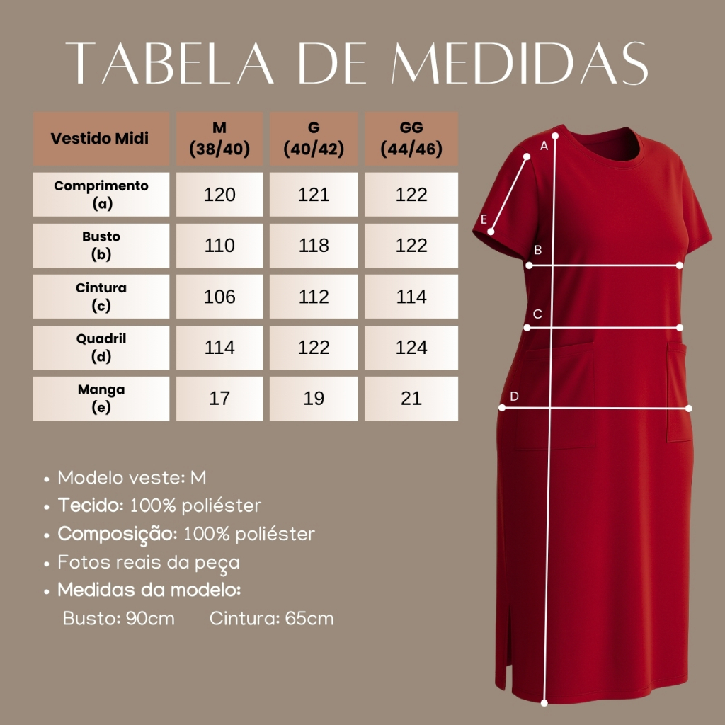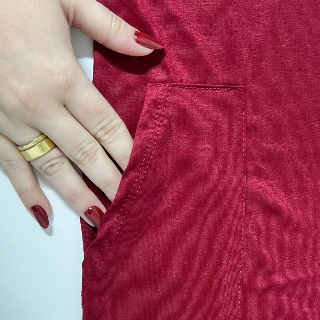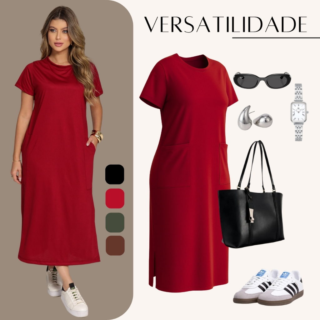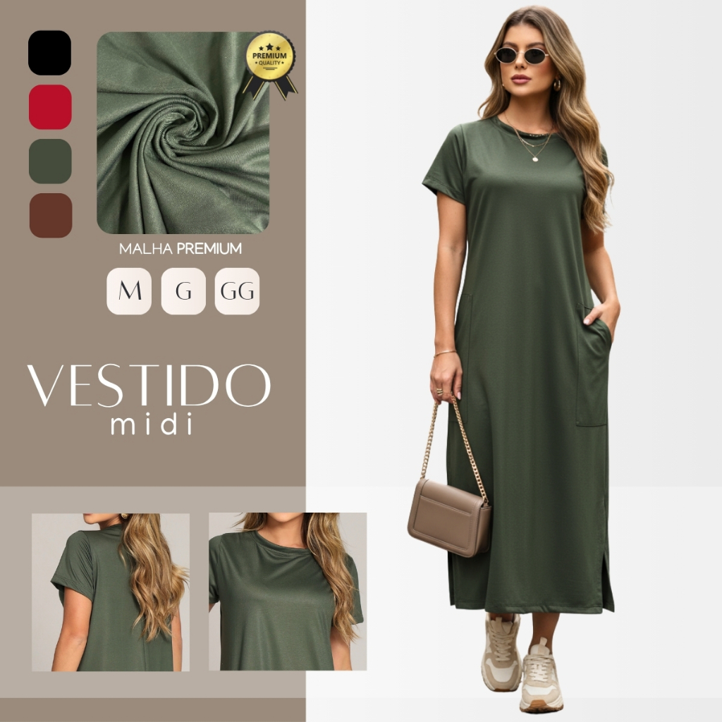 Vestido Midi Manga Curta Feminino Com Fenda Lateral e Bolso Externo Versátil M ao GG