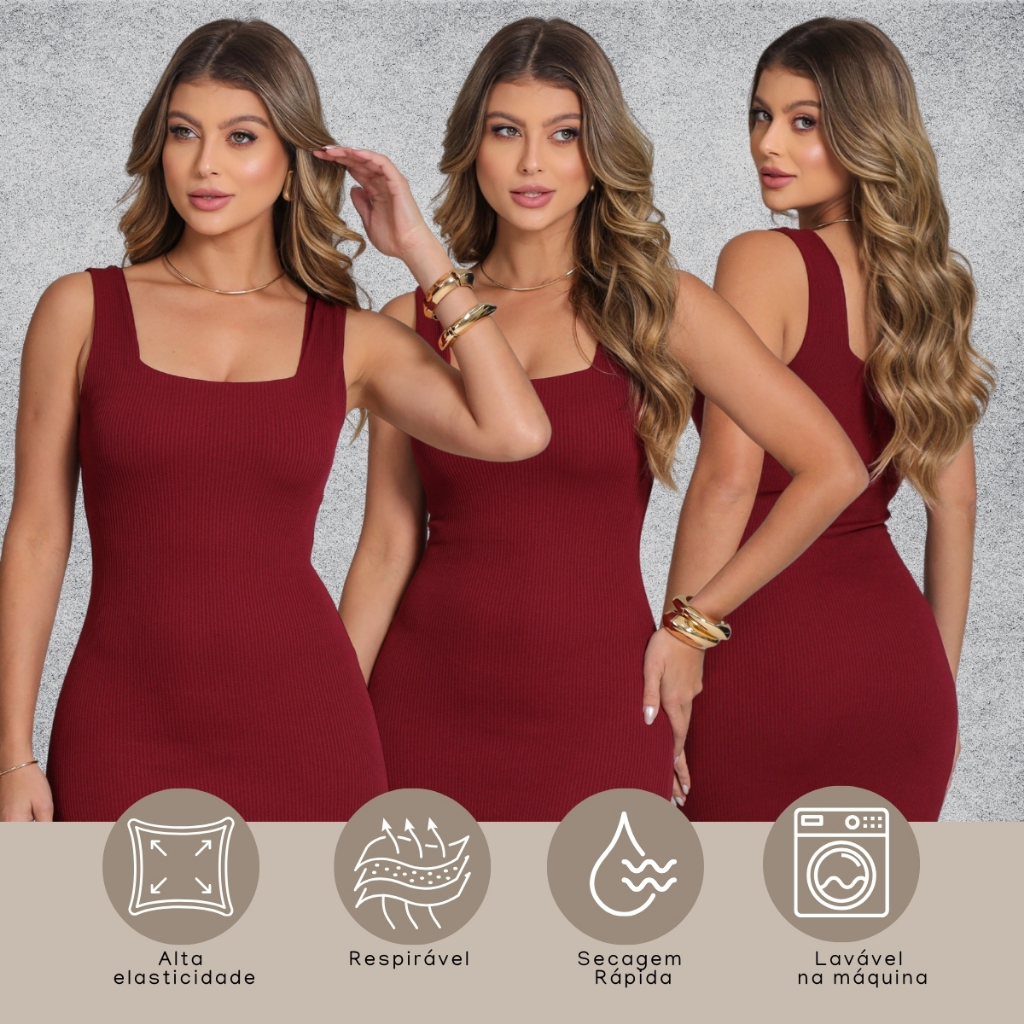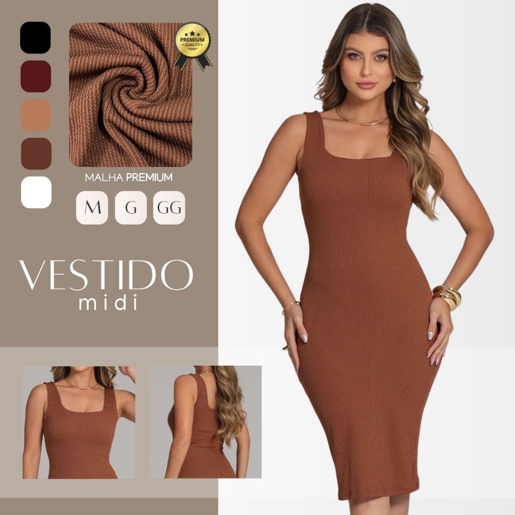 Vestido Feminino Midi Gola Quadrada Acinturado Tubinho M ao GG