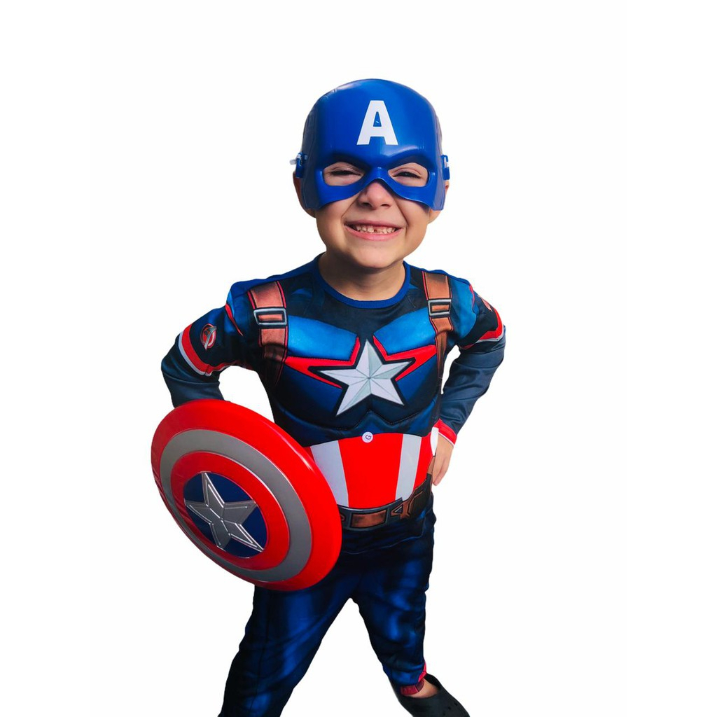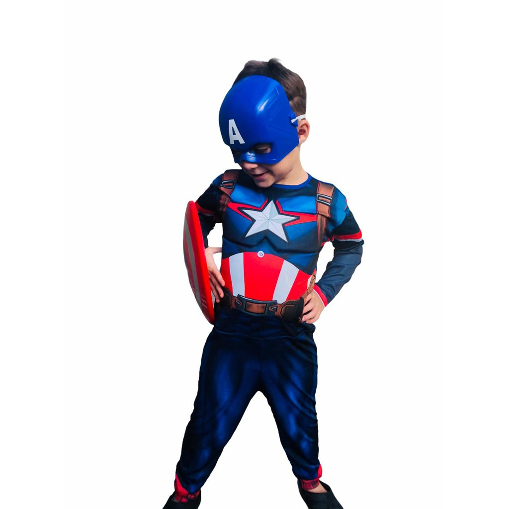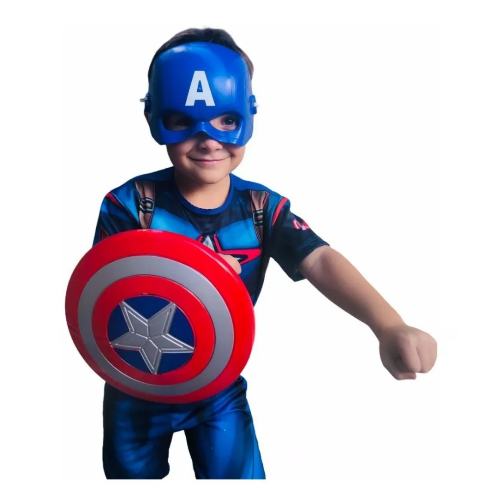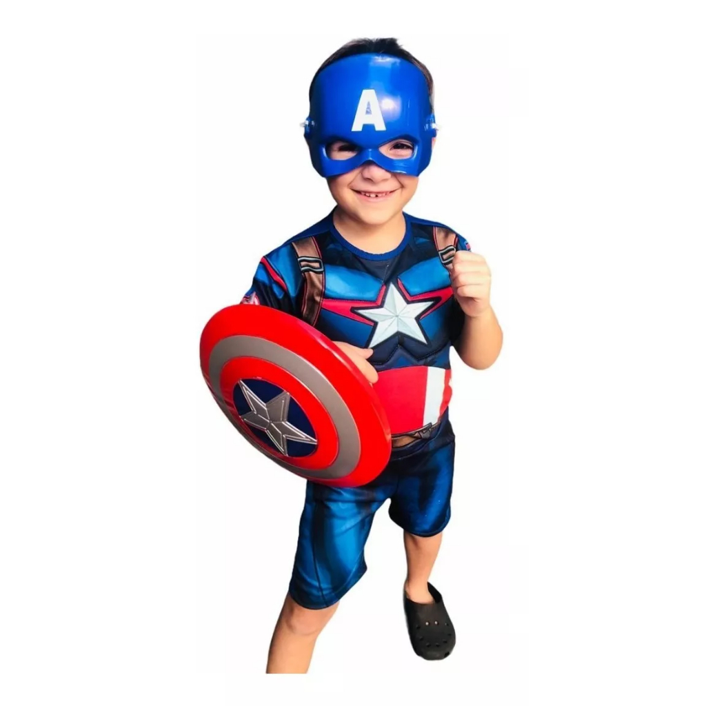 Fantasia Capitão América Longo ou Curto Com Máscara Escudo e Enchimento