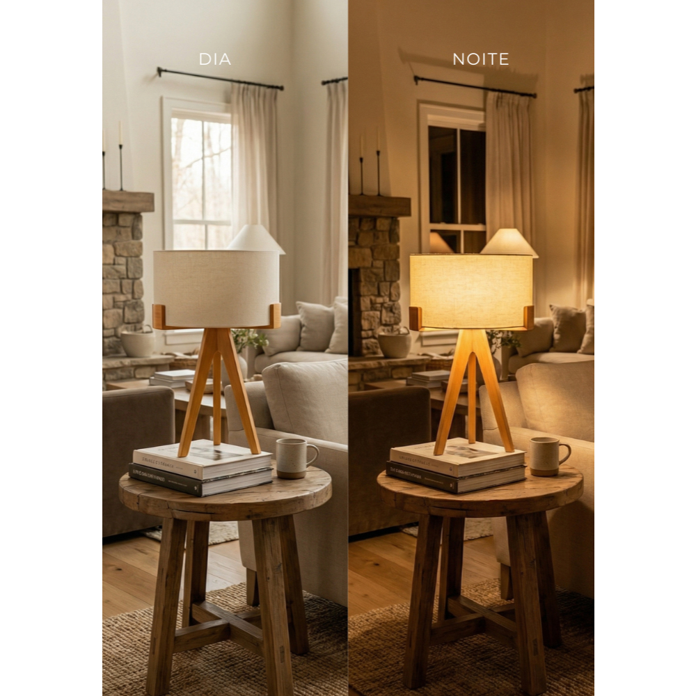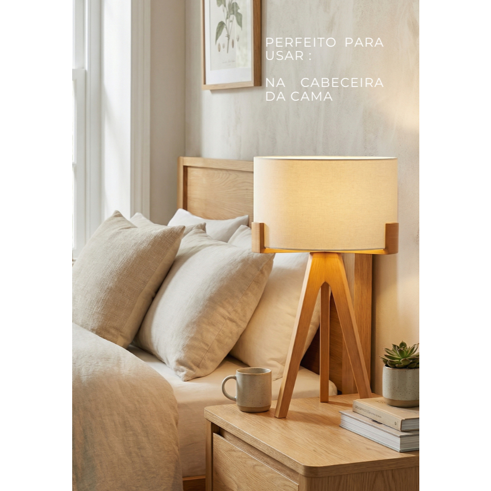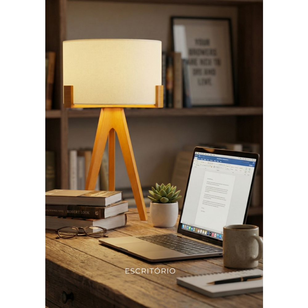 Abajur de Mesa Áustria Tripé em Madeira com Cupula Minimalista Decorativo para Sala Quarto