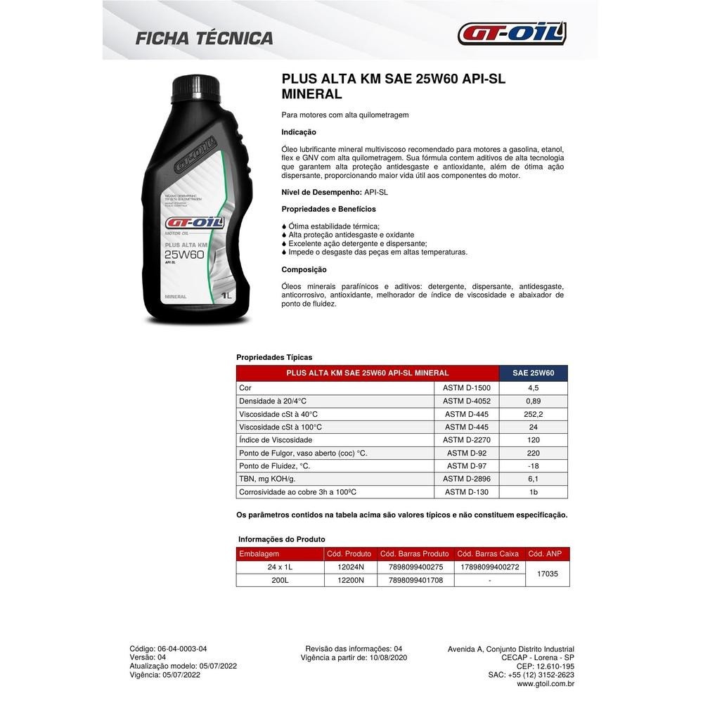 Kit 3 Óleo De Motor Gt Oil Plus Alta Km 25w60 Api Sl Mineral