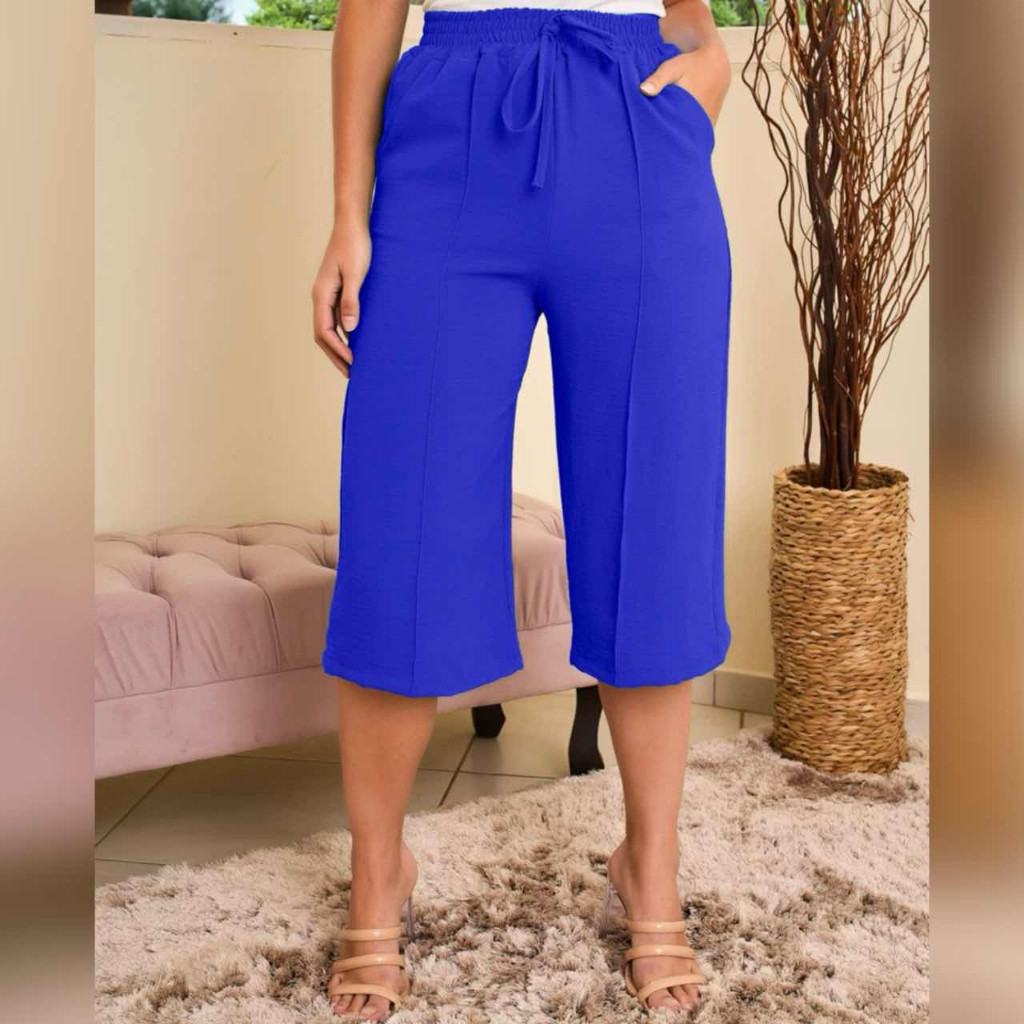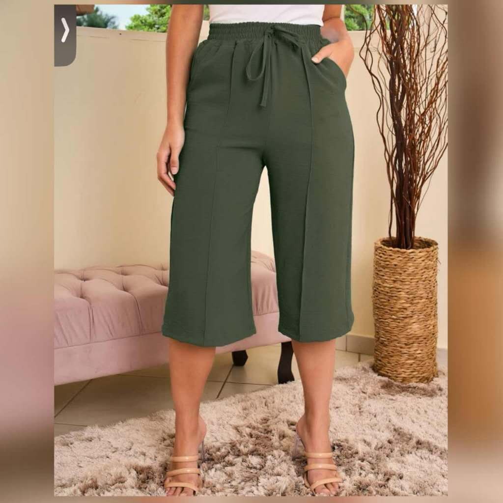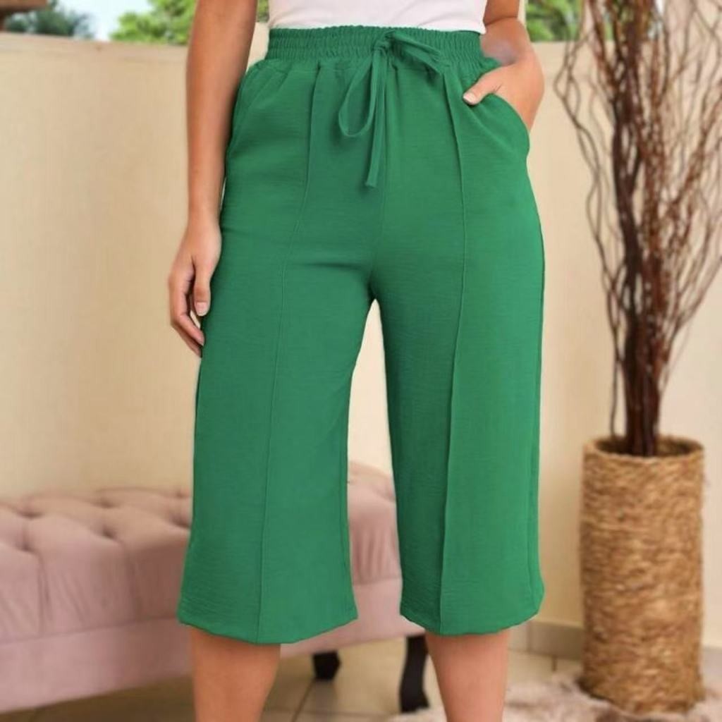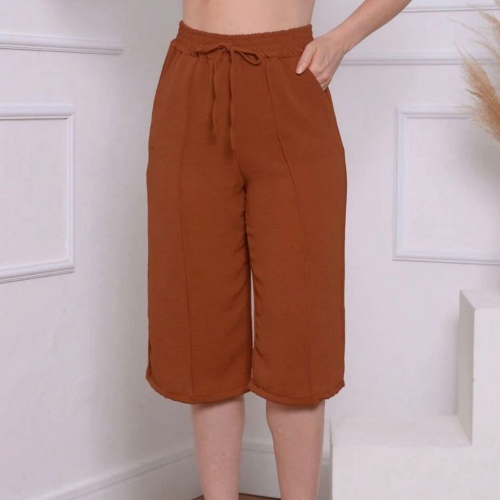 Calcas cortadas feminina de cor solida casual retas liso tecido duna ate a canela