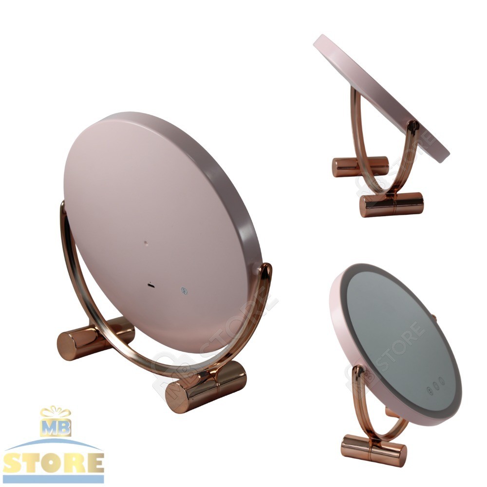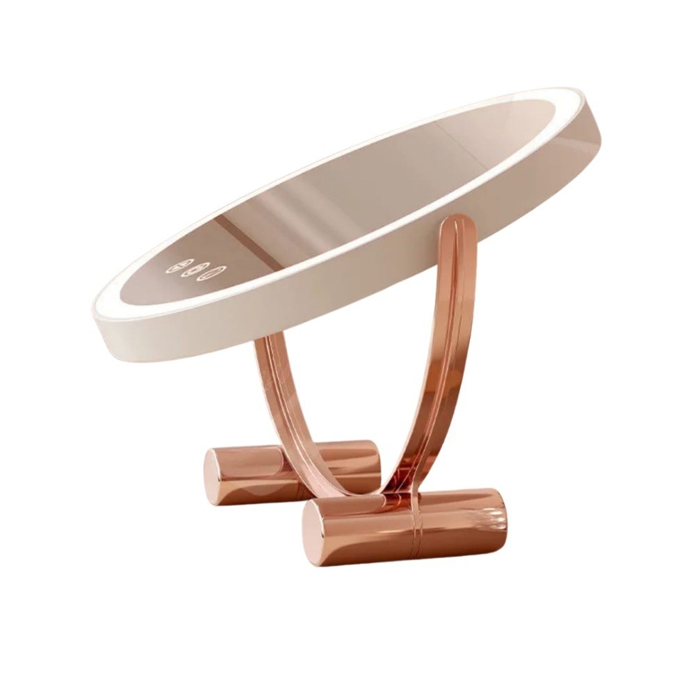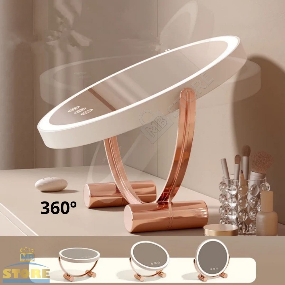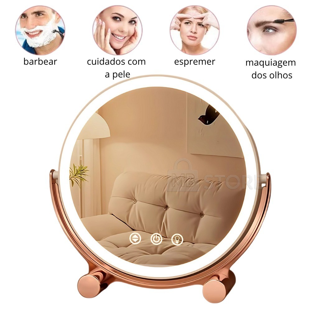 Espelho Maquiagem LED Recarregável Redondo 3 Luzes Touch Moderno Grande Giratório Rose Gold