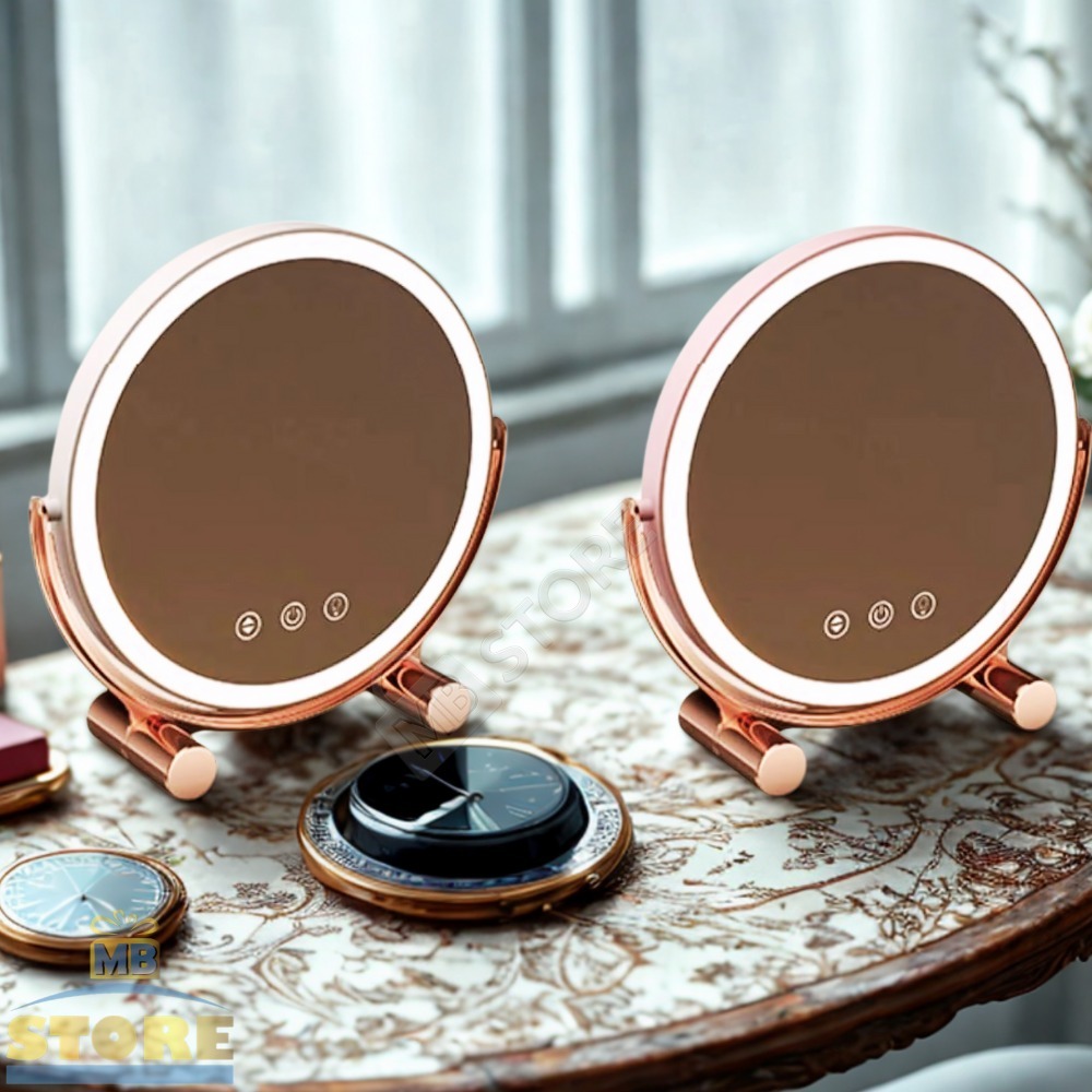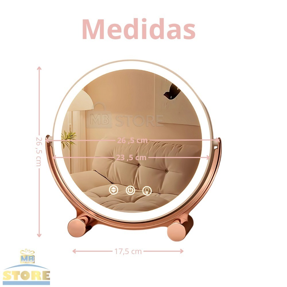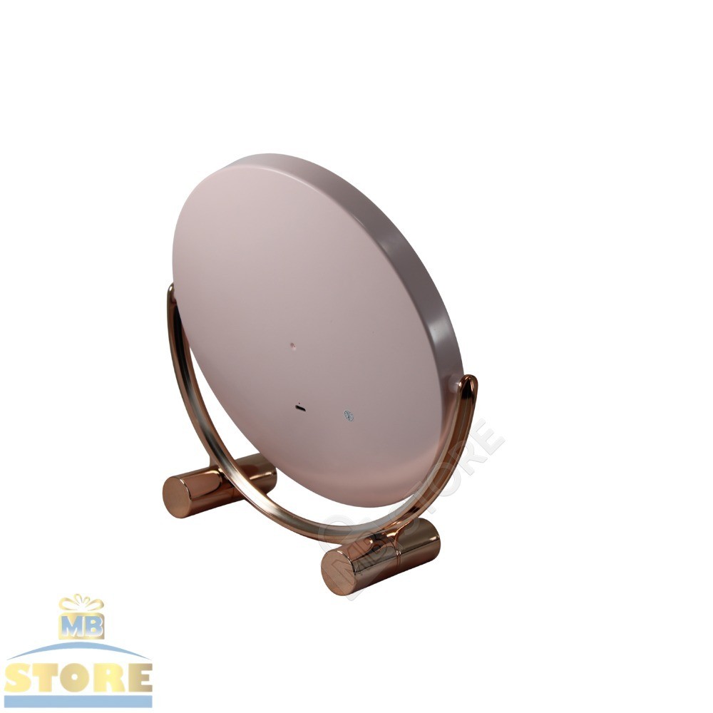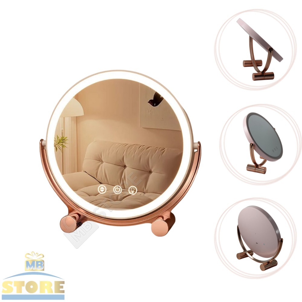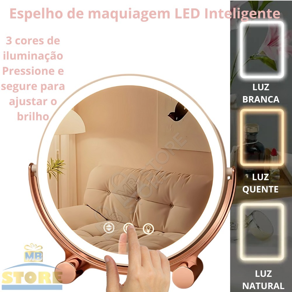 Espelho Maquiagem LED Recarregável Redondo 3 Luzes Touch Moderno Grande Giratório Rose Gold
