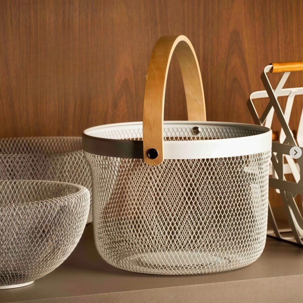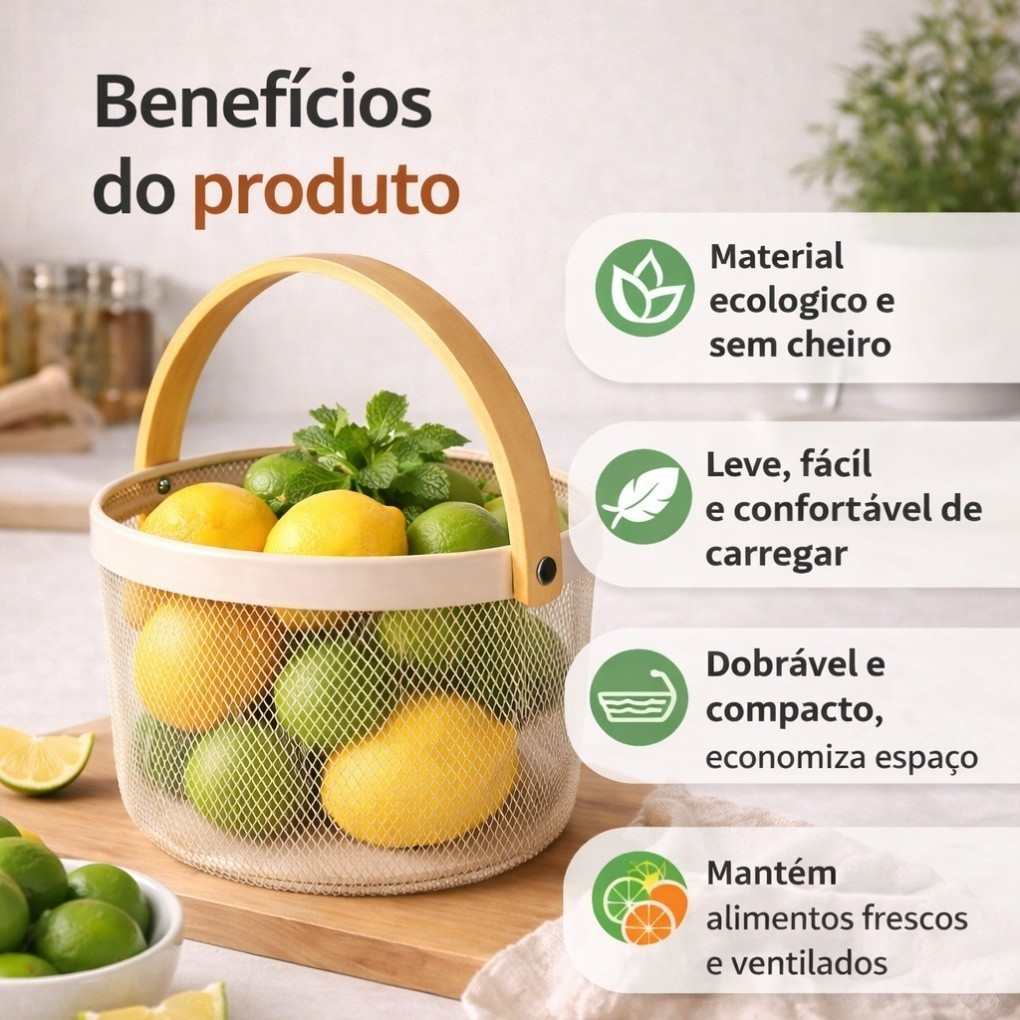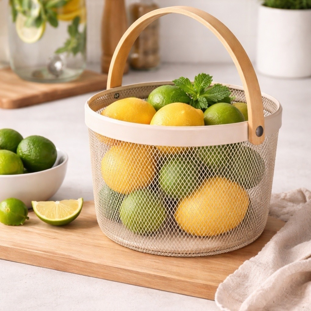 Cesto de Armazenamento Redondo em Metal Aramado com Alça de Madeira | Fruteira para Cozinha, Piquenique e Organização