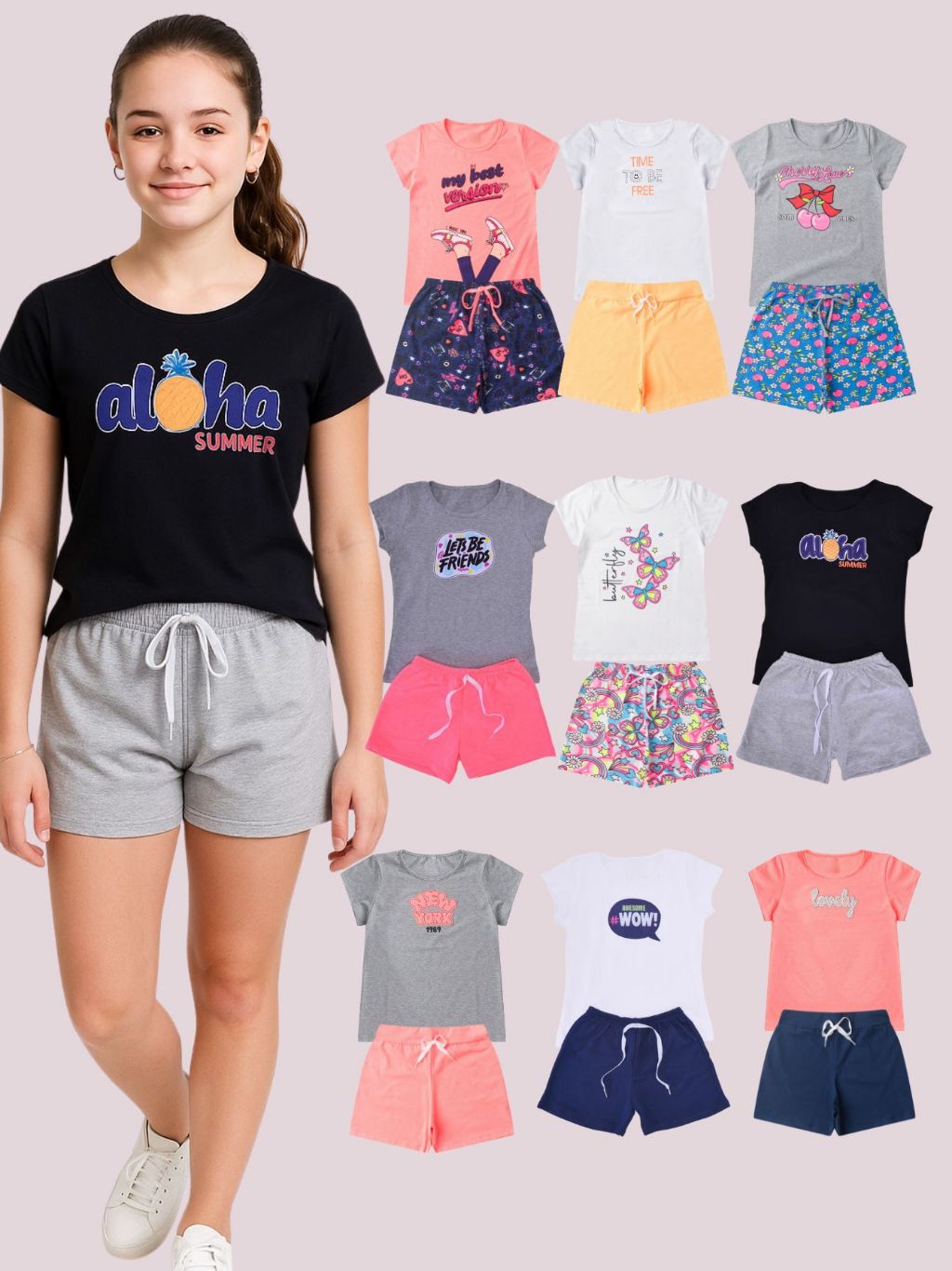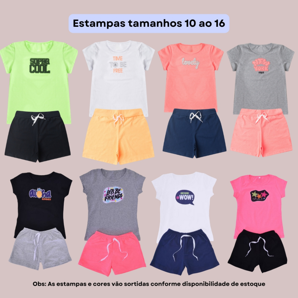 Kit 4 Peças Infantil Juvenil Menina Conjunto Roupa Sortido Blusa Shorts Verão Algodão Blogueirinha