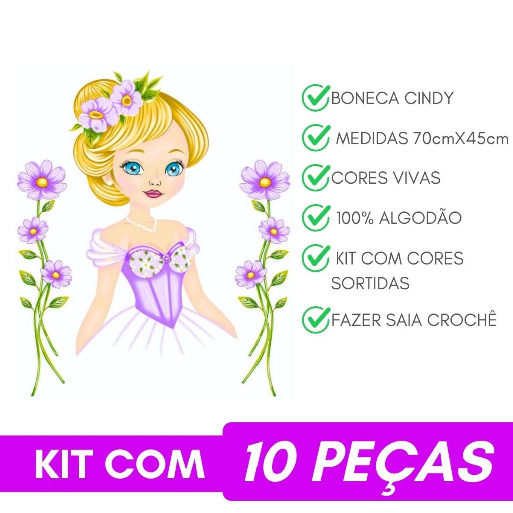 Kit 10 Pano de Prato Boneca Artesã Cindy 100% Algodão 70x45cm Para Aplicar Saia de Crochê