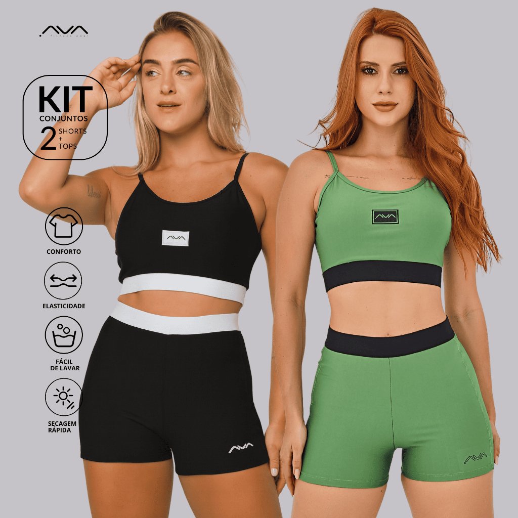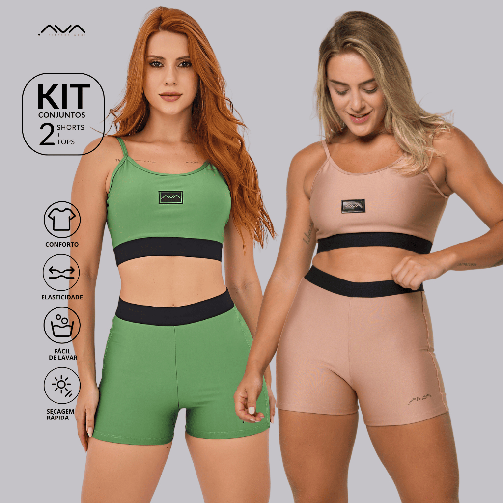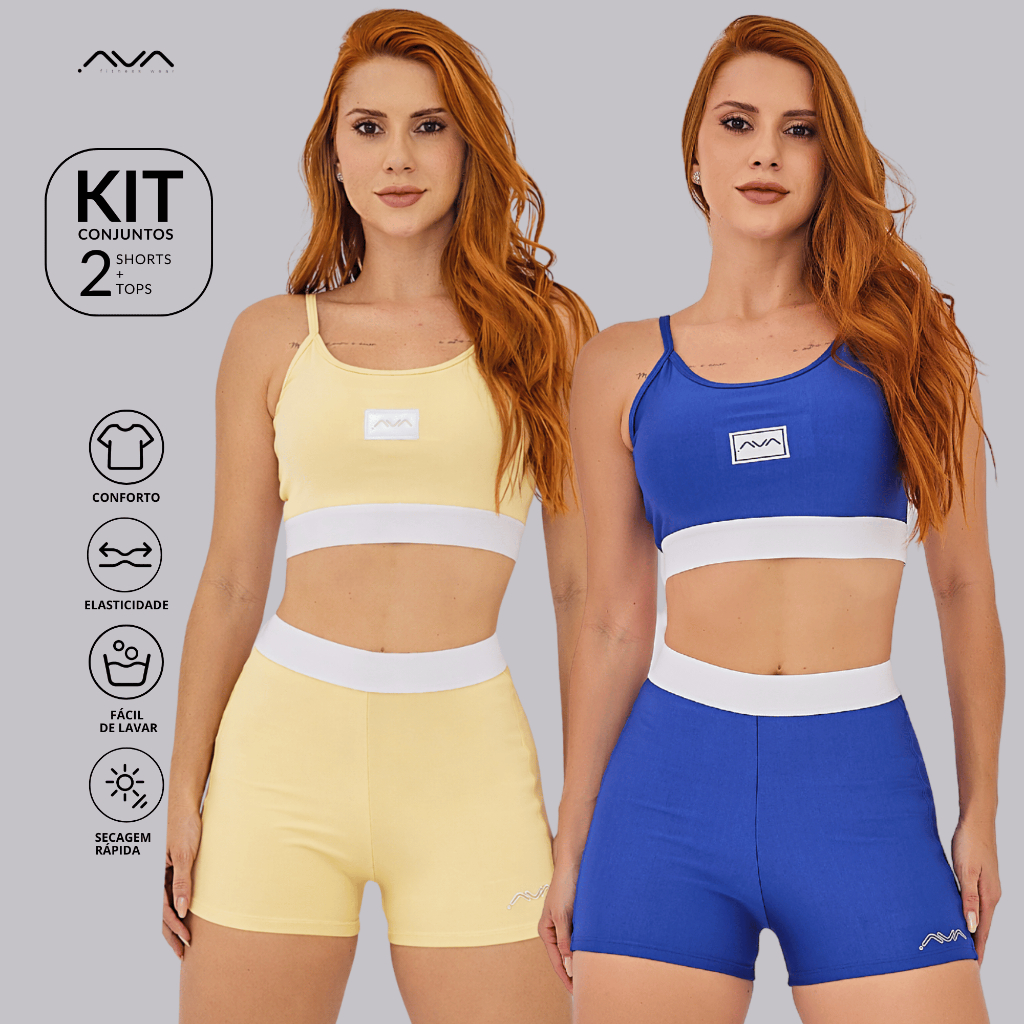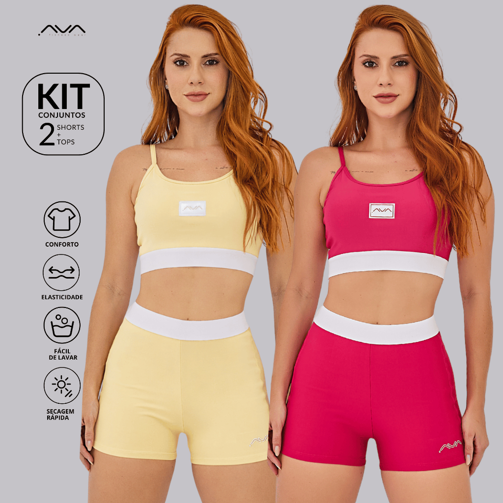 Kit 2 Conjuntos Feminino Academia Suplex Poliamida Top e Short Com Elástico No Cós AVA Fitness
