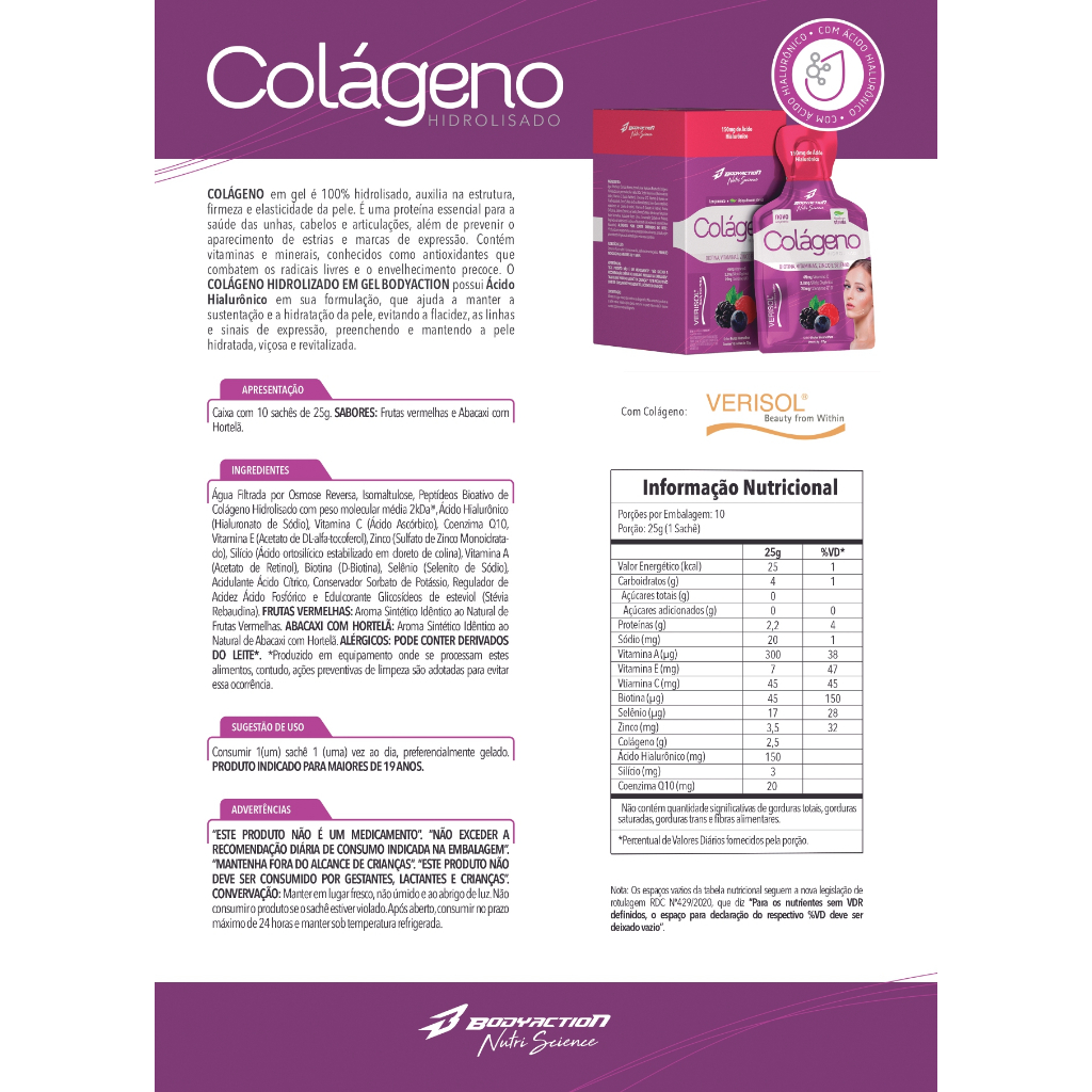 Colágeno Verisol com Ácido Hialurônico Gel 10 Sachês Bodyaction