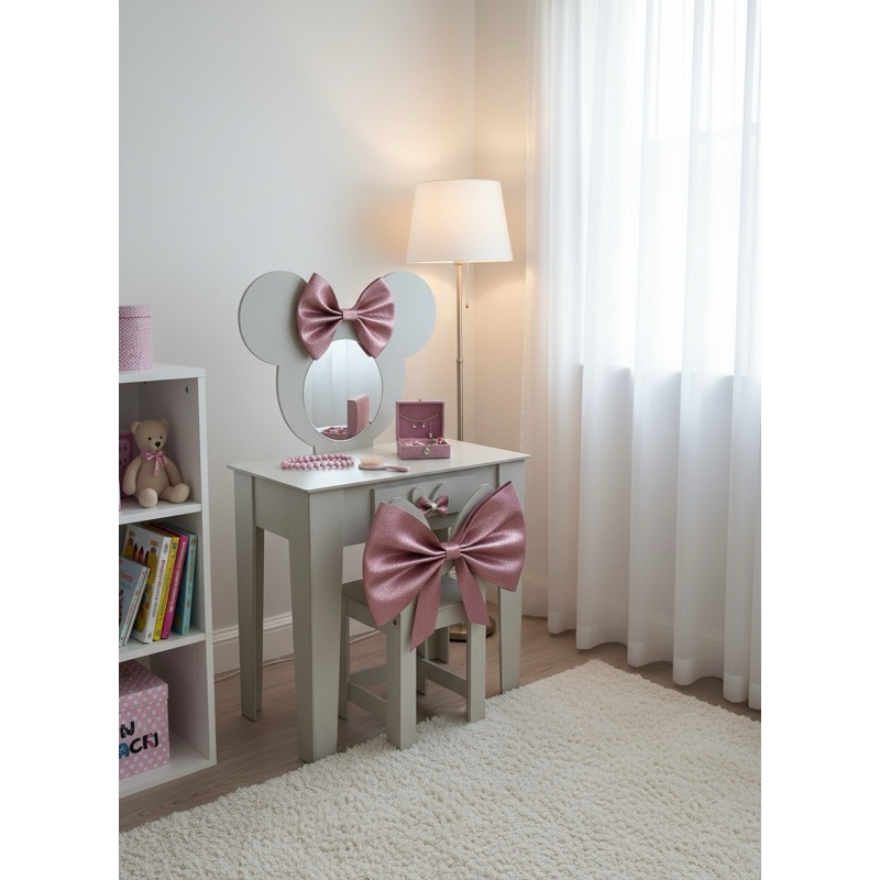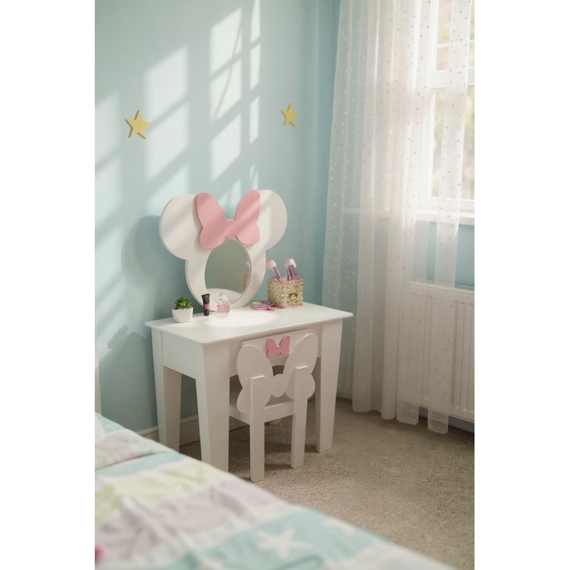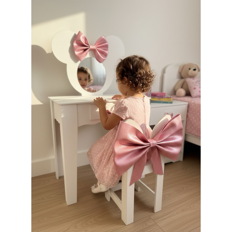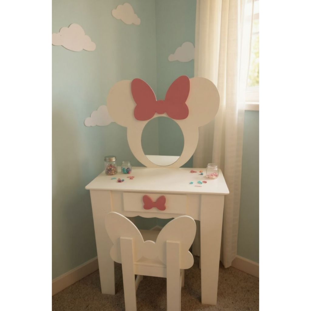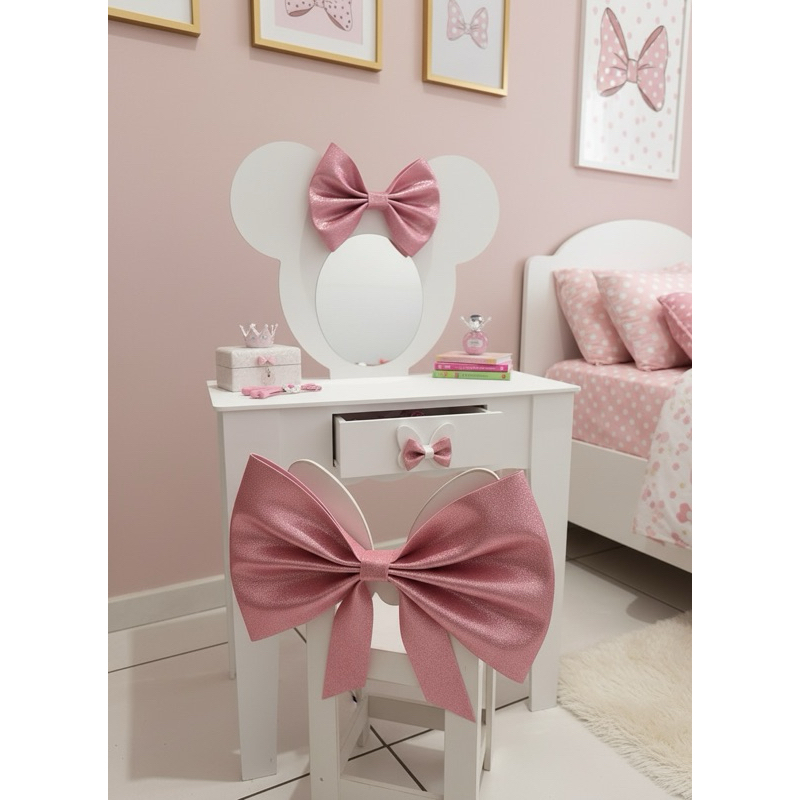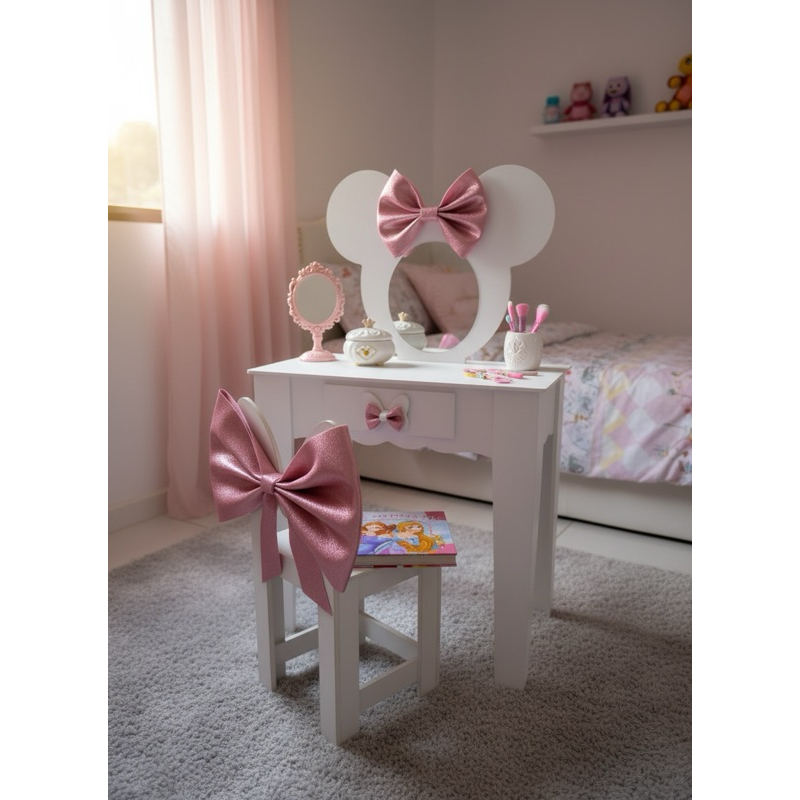 Penteadeira infantil escrivaninha com banqueta e moldura com espelho em MDF