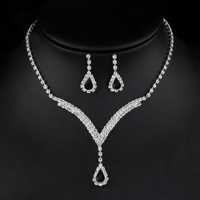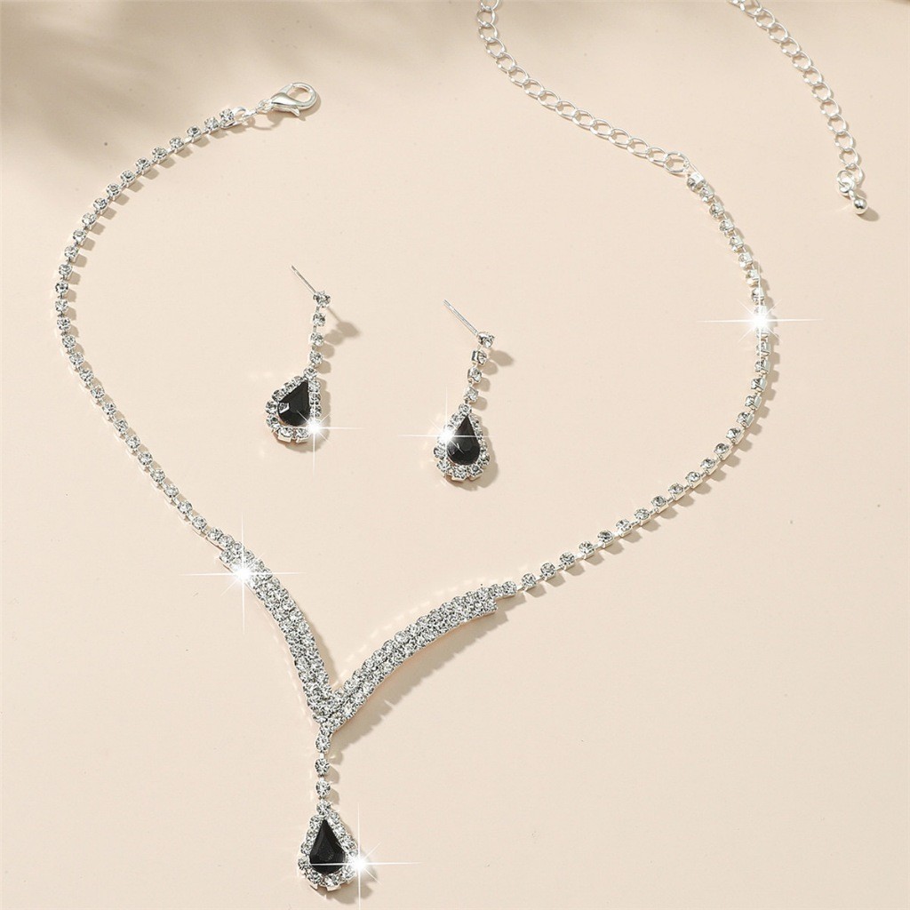 Conjunto de Joias Feminino - Colar V + Brincos Gota, Strass Brilhante + Pedras Pretas, Estilo Festivo
