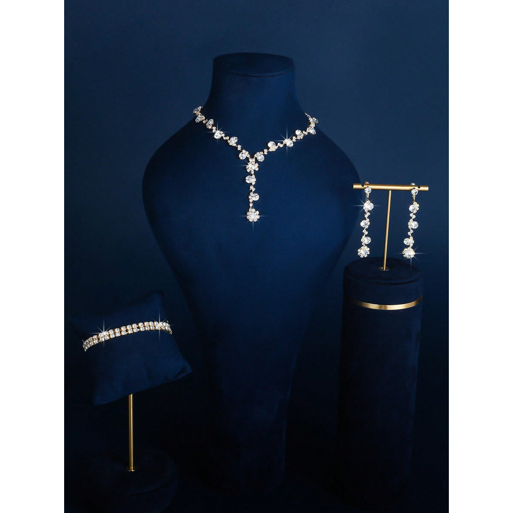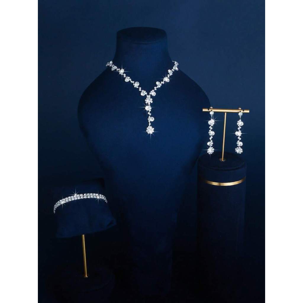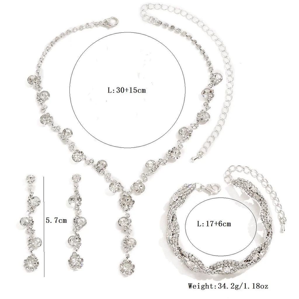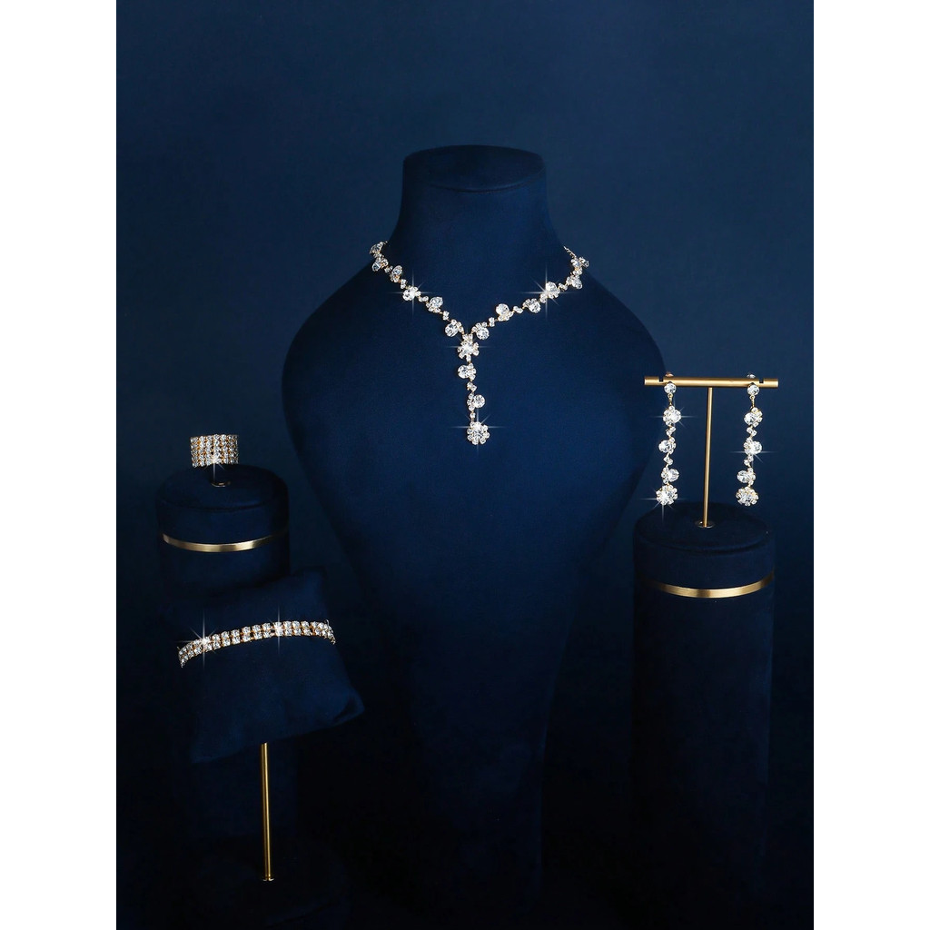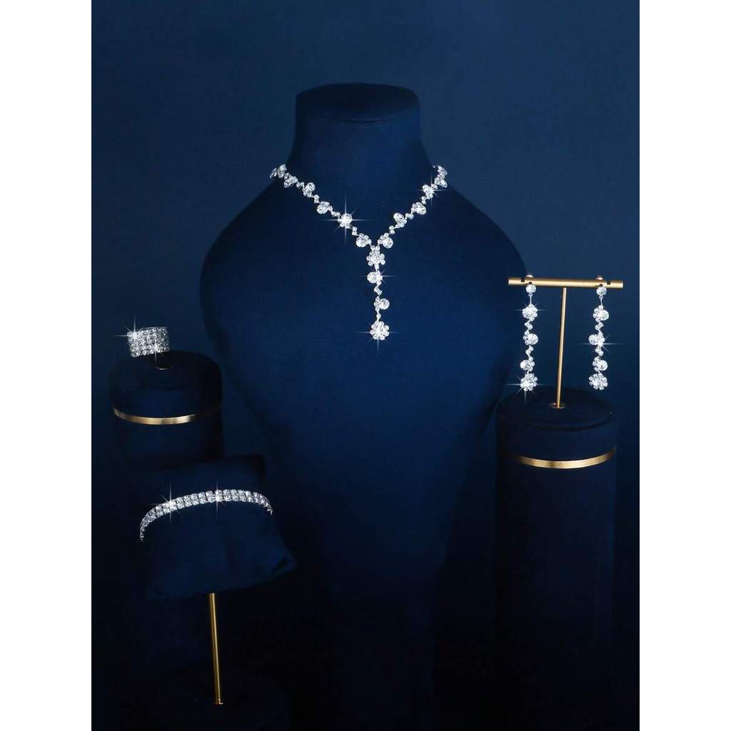 Conjunto 4 Peças de Bijuteria Brilhante , Brincos, Colar, Pulseira e Anel com Cristais & Strass ,Presente Feminino