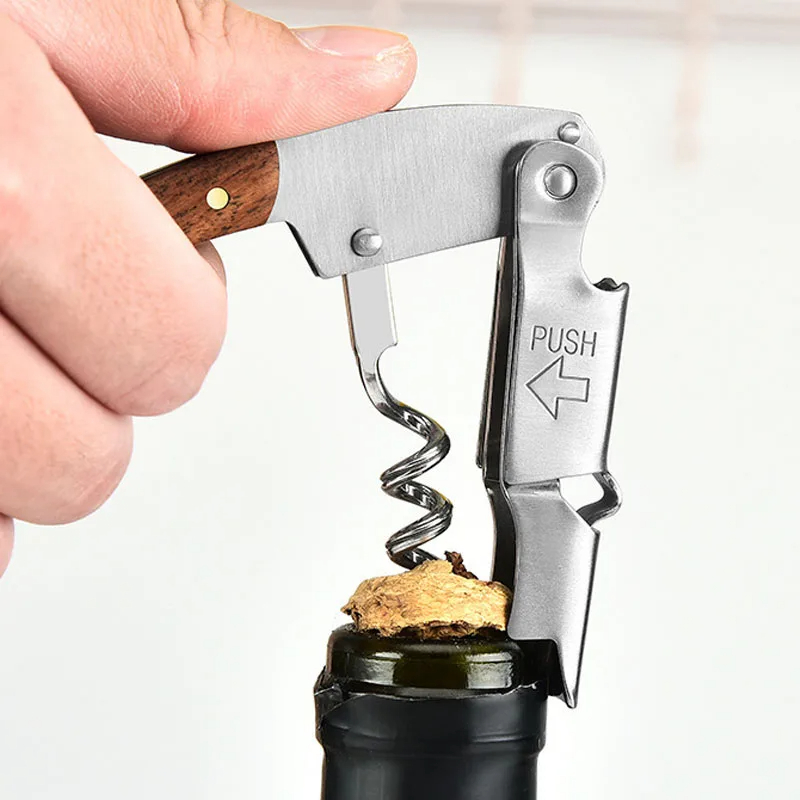Abridor de garrafas de vinho de aço inoxidável com alça de madeira multifuncional