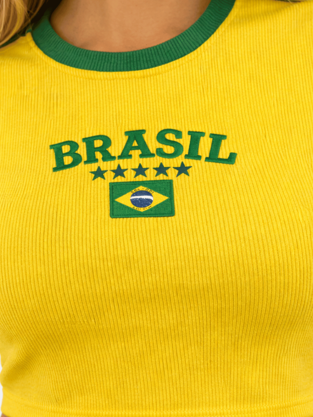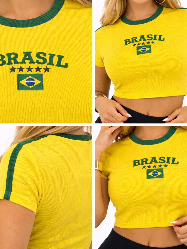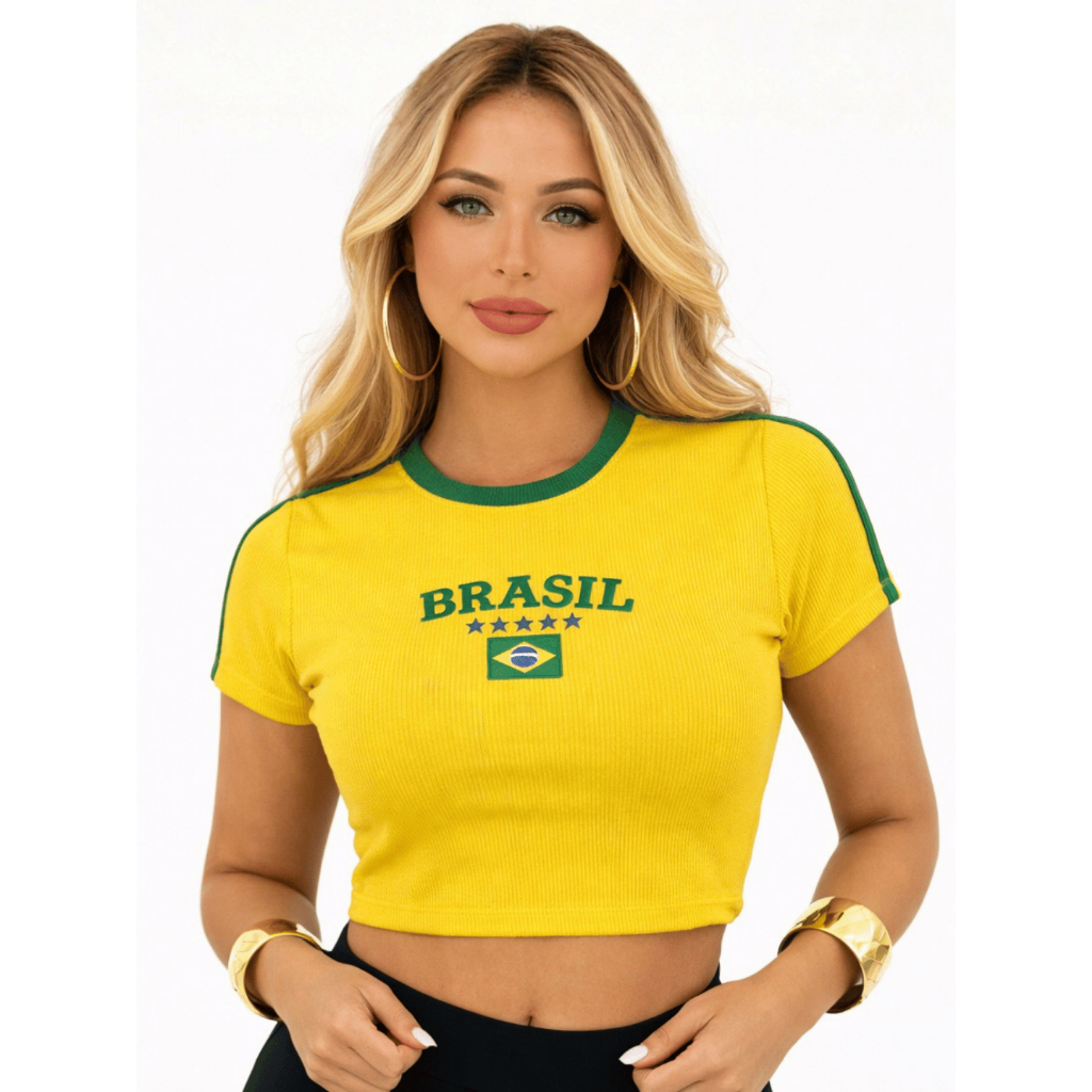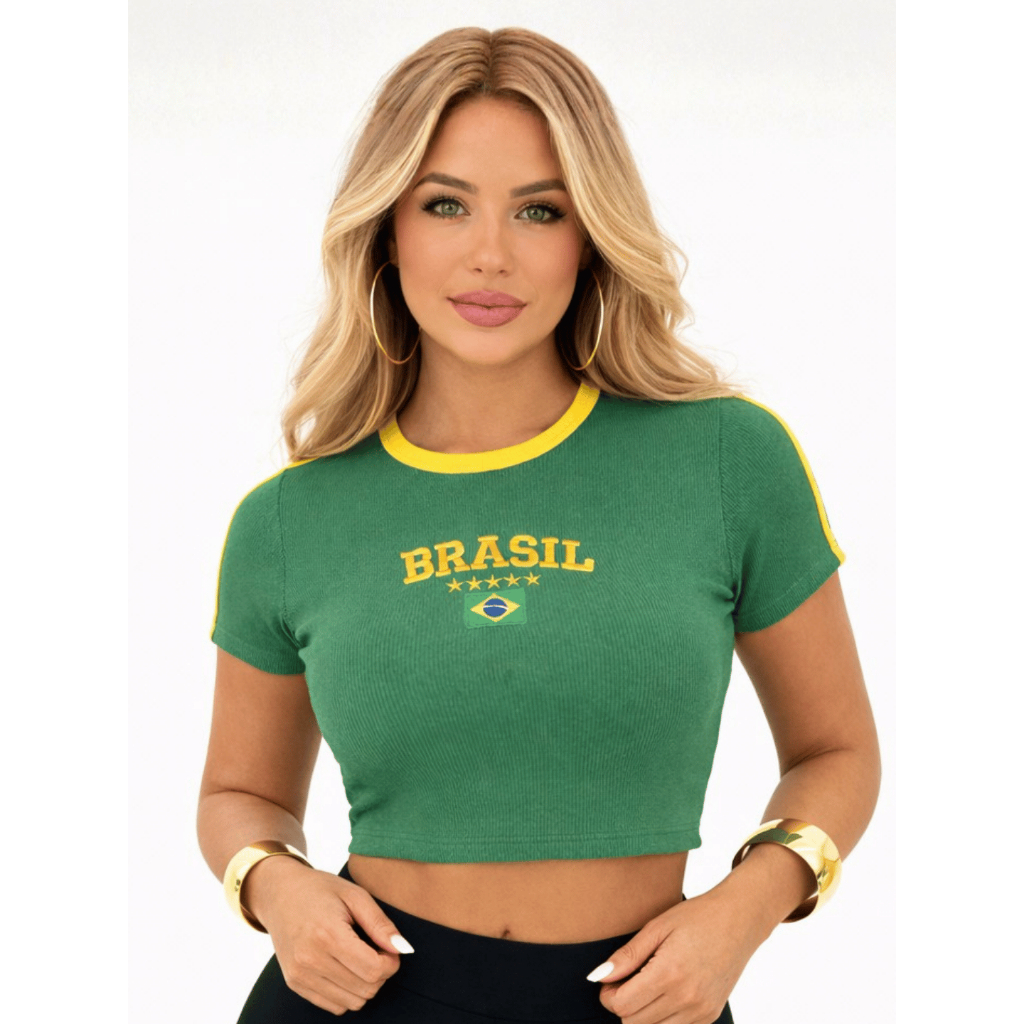 Cropped Brasil Feminino Torcedora Copa Canelado Bordado Manga Curta Verde Amarelo Tendencia