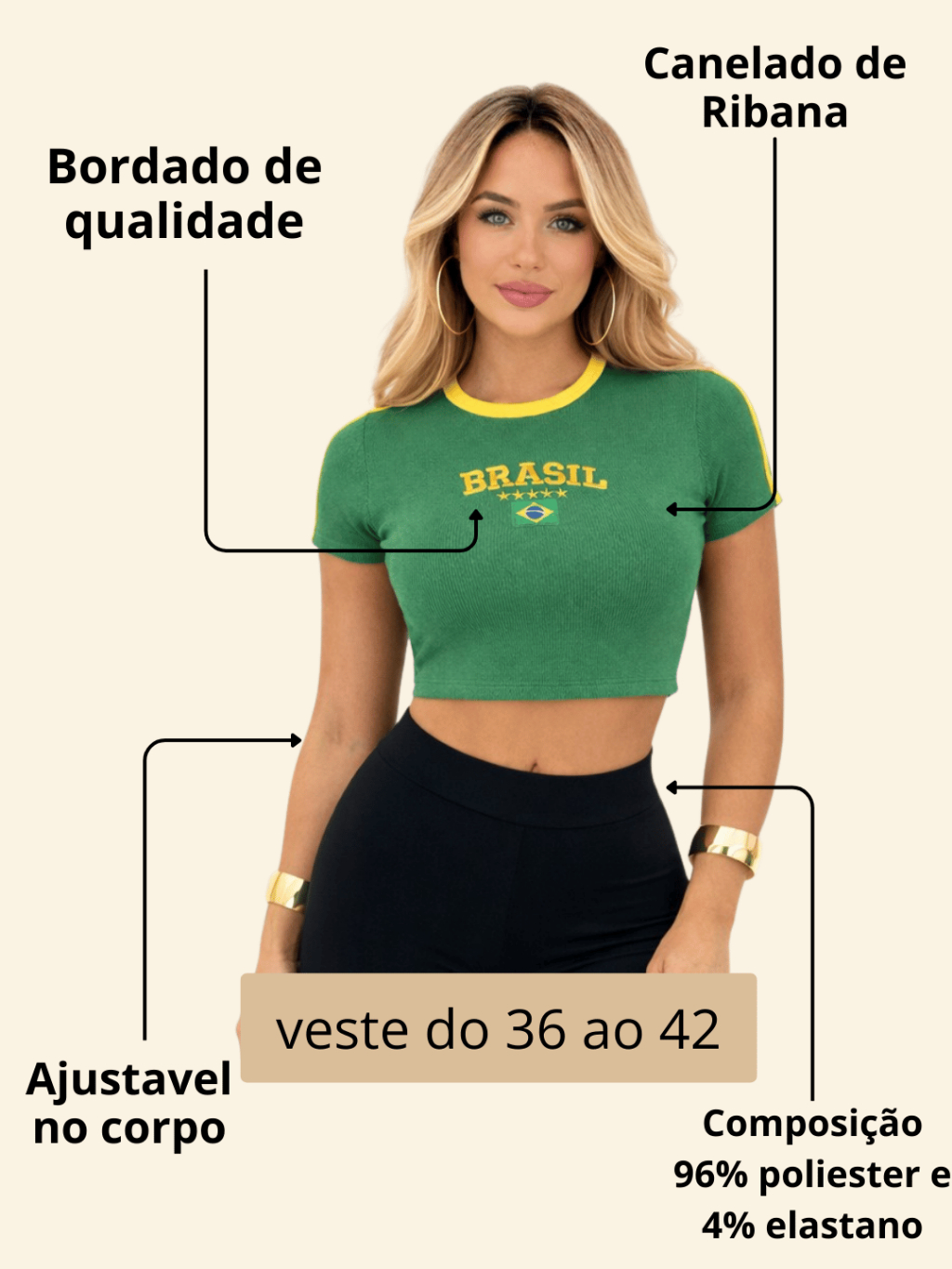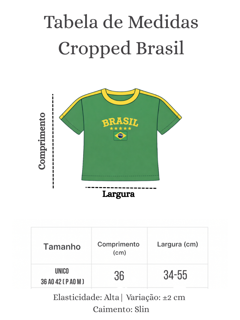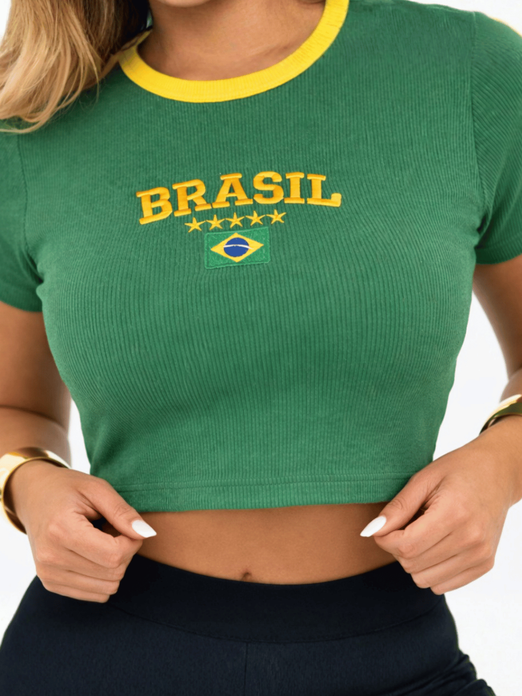 Cropped Brasil Feminino Torcedora Copa Canelado Bordado Manga Curta Verde Amarelo Tendencia