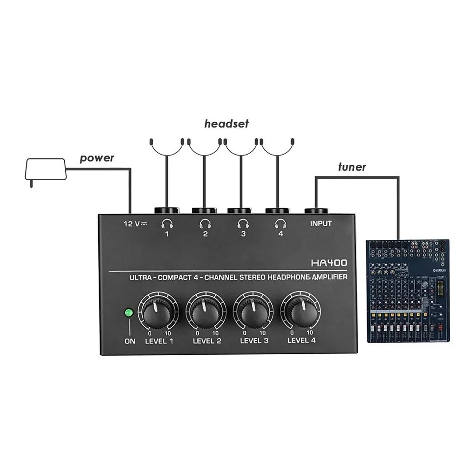 Amplificador Fone De Ouvido Ha400 4 Canais P10 com Fonte para Gravação Retorno Música Podcast Stereo
