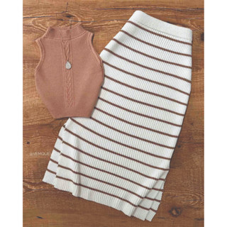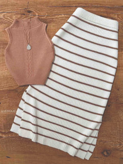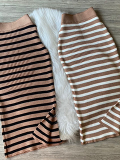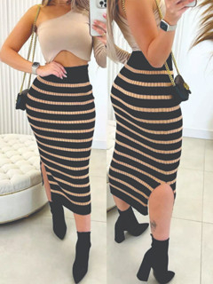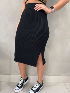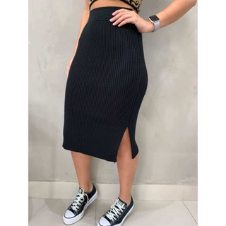 Saia Mide Canelada com Listras e Fenda Trico Modal blogueira Tendência Saia Midi Tricot