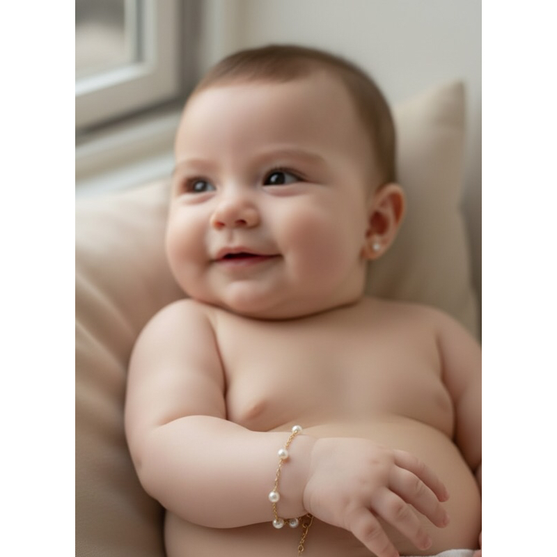 kit pulseira+Brinco de pérolas infantil recém-nascido 3mm Banhado a ouro 18k + Saquinho de Veludo.