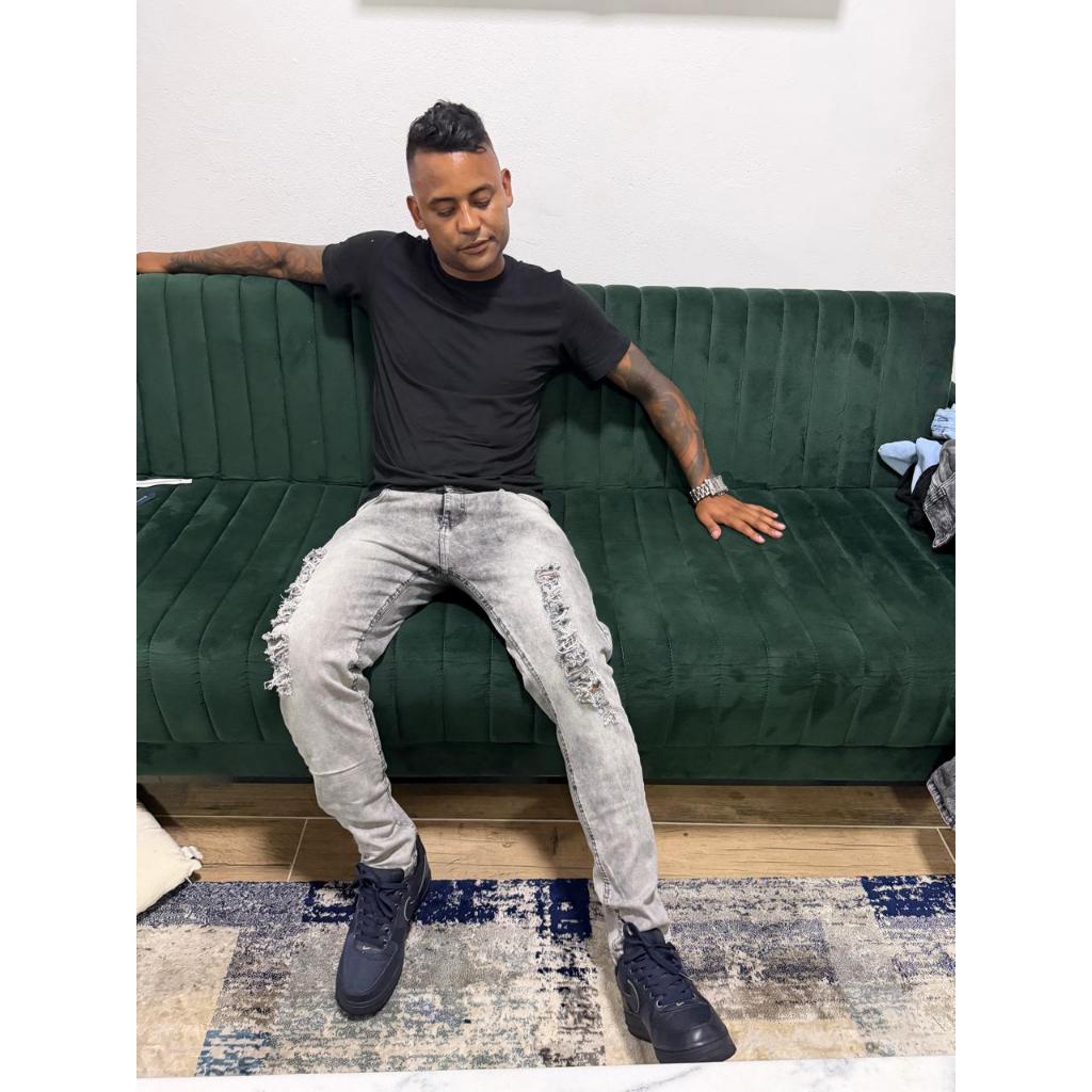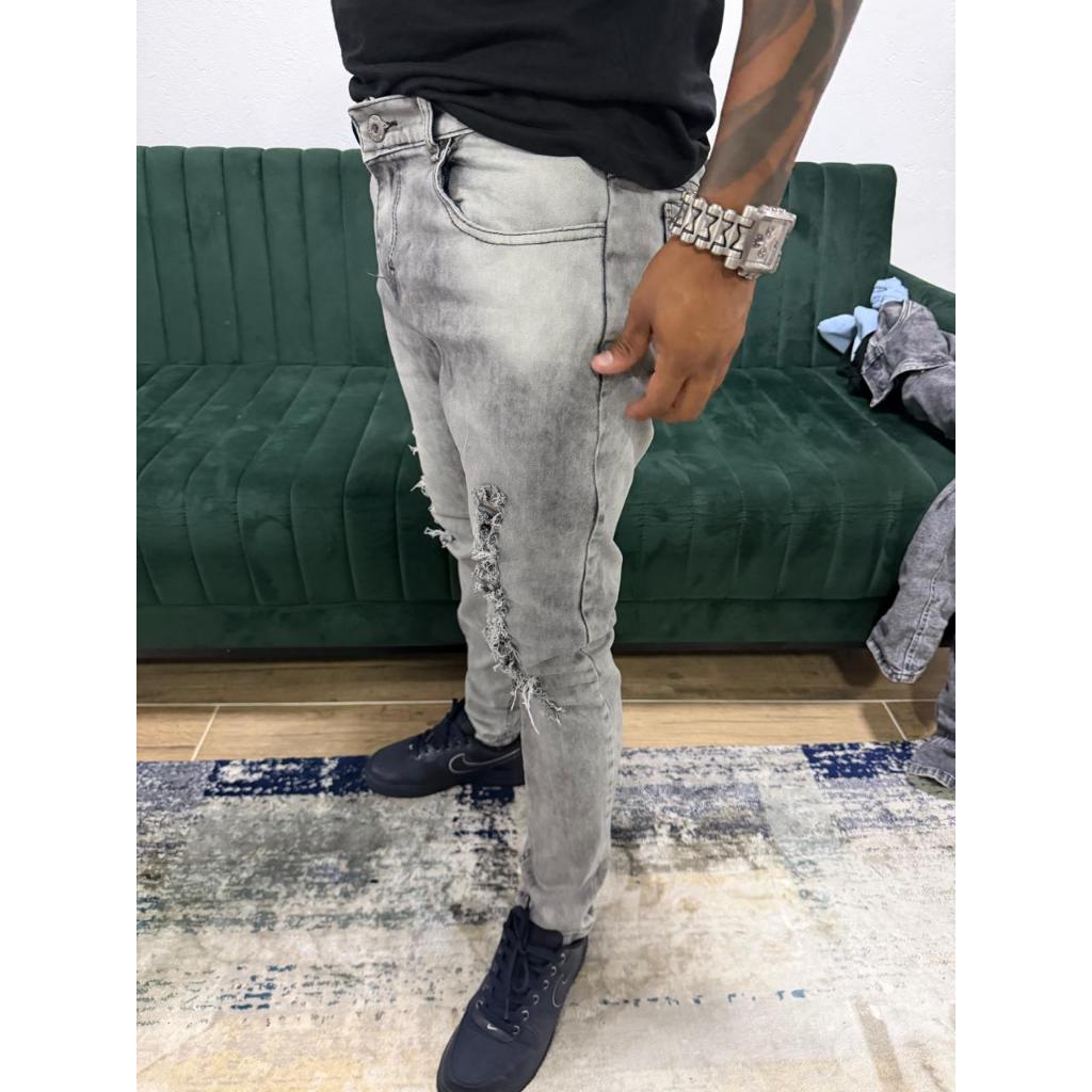 Calça jogador clara rasgada Masculina Skinny Destroyed Elastano/ Cinza Grafite