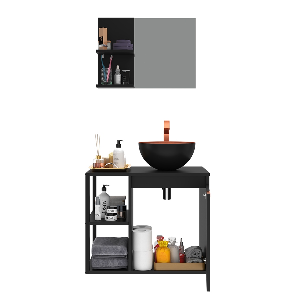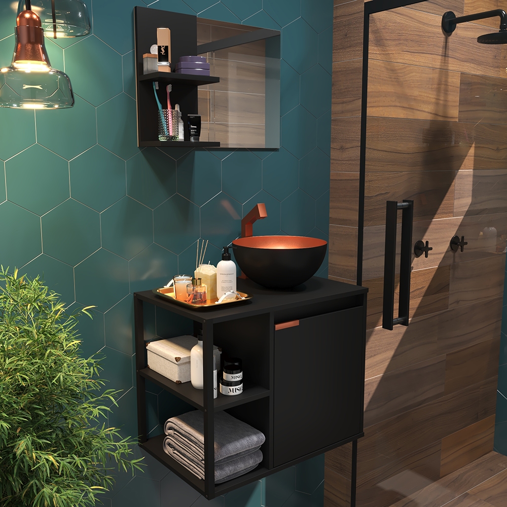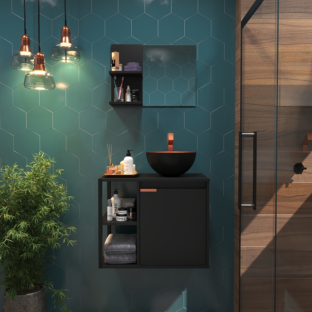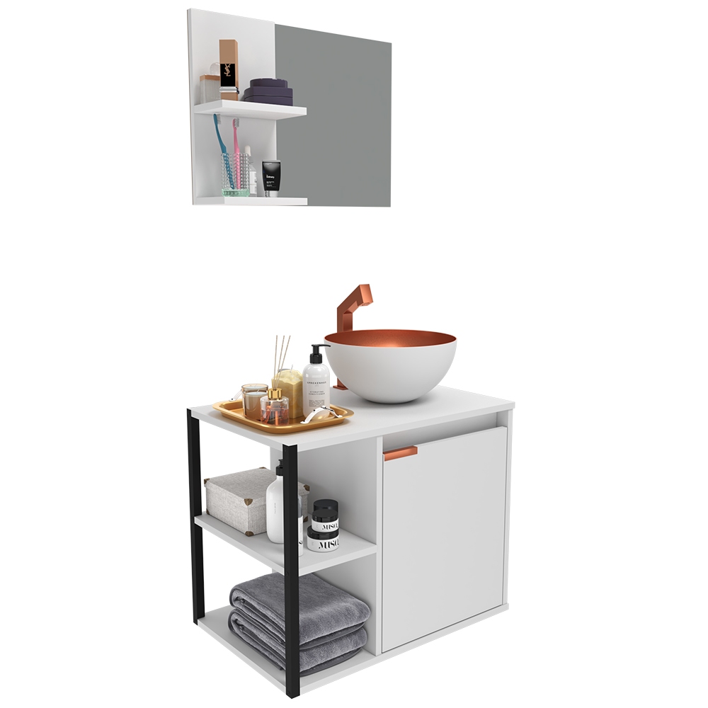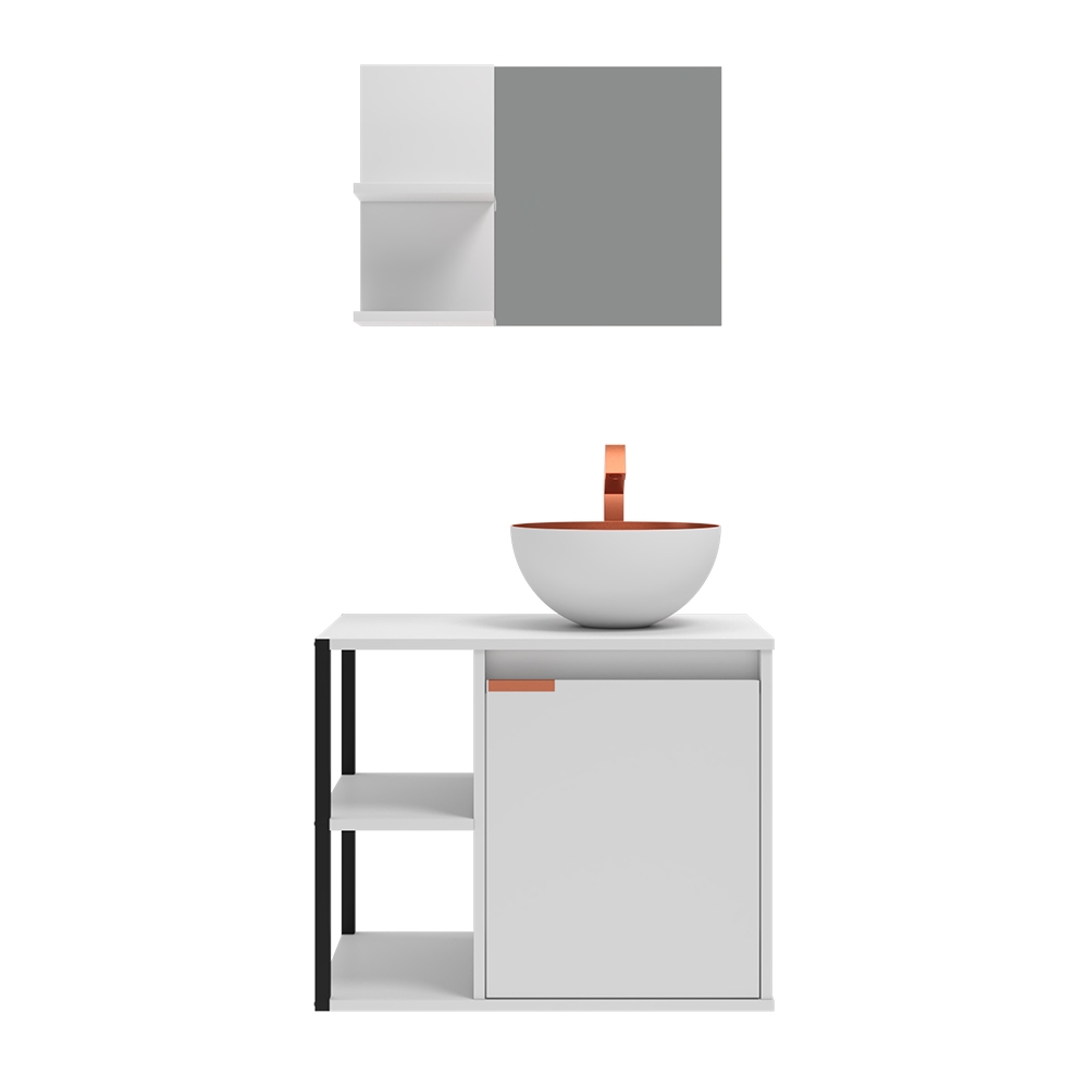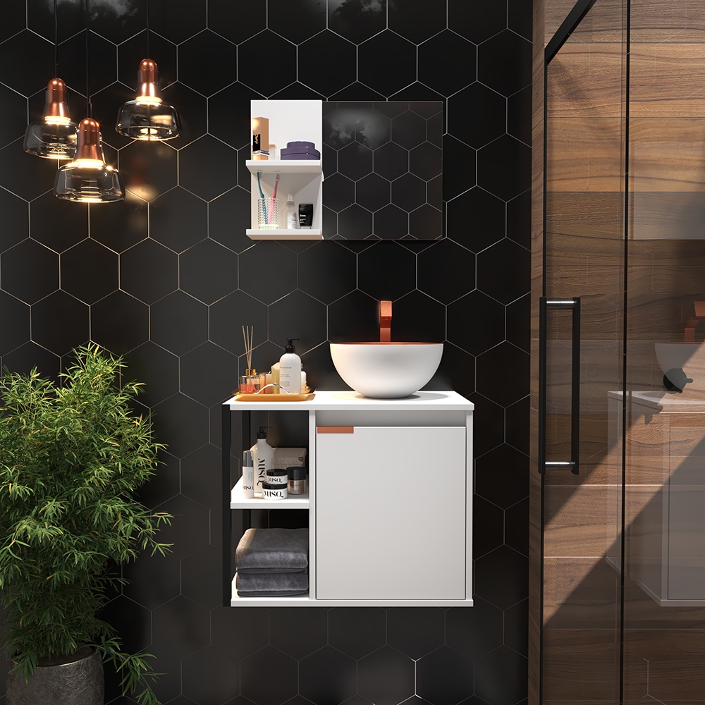 Kit Gabinete Banheiro com Armário, Cuba e Espelheira – Design Premium Moderno com Puxador Cobreado Estiloso