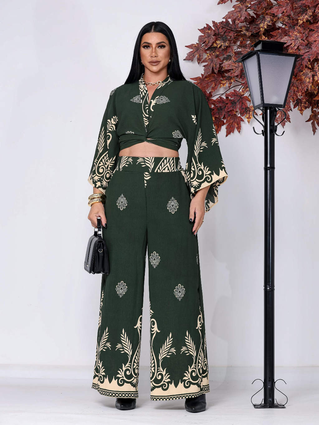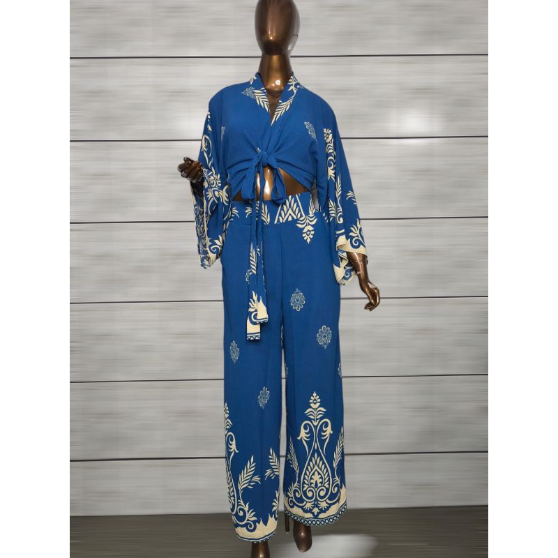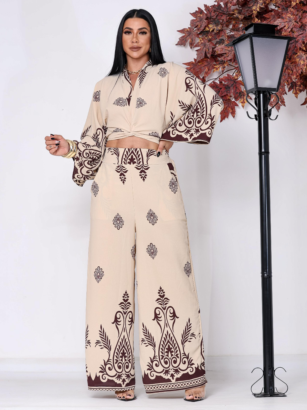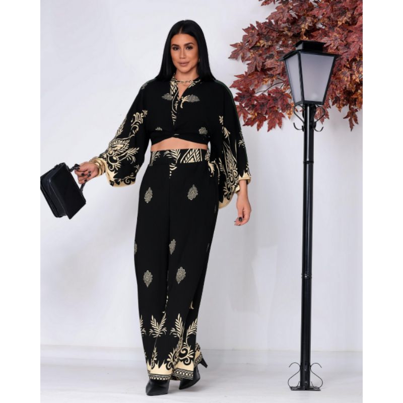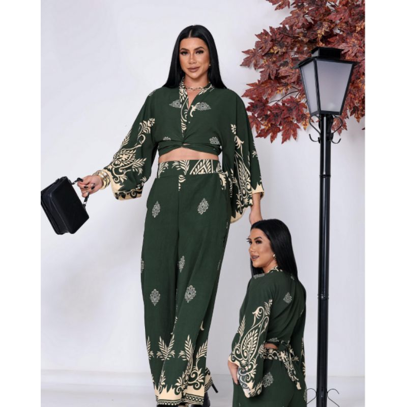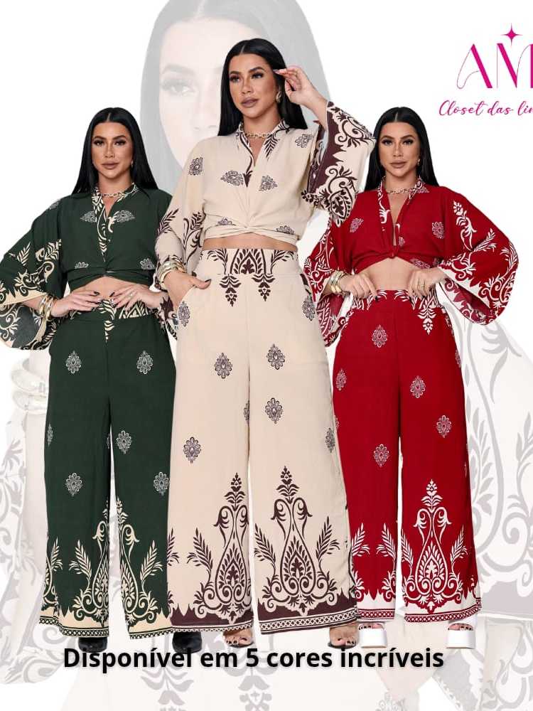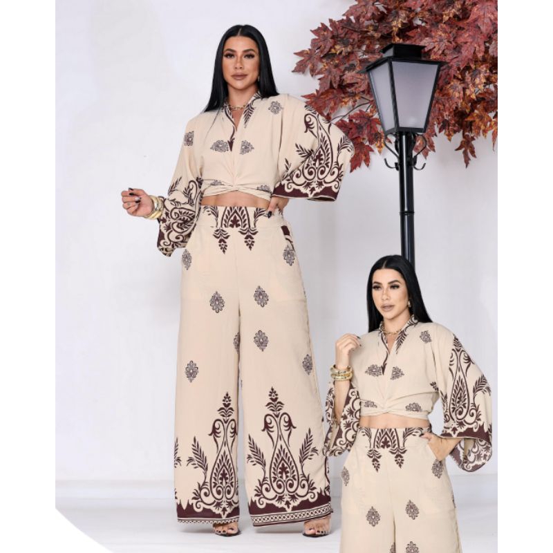 Conjunto Feminino Estampado Barrado, Blusa Multiformas + Calça Pantalona Forrada com Elástico na Cintura tecido Duna