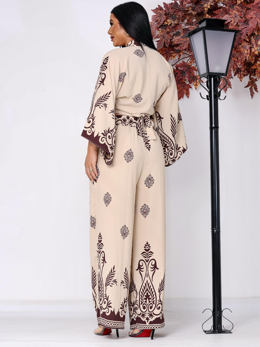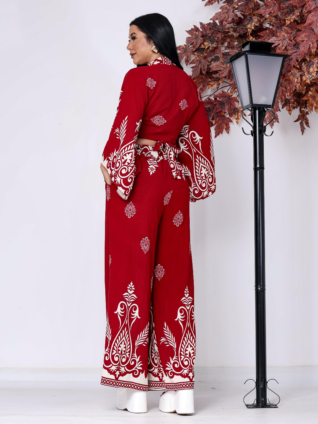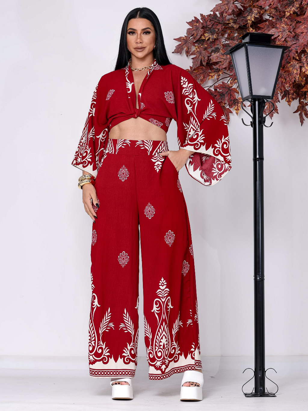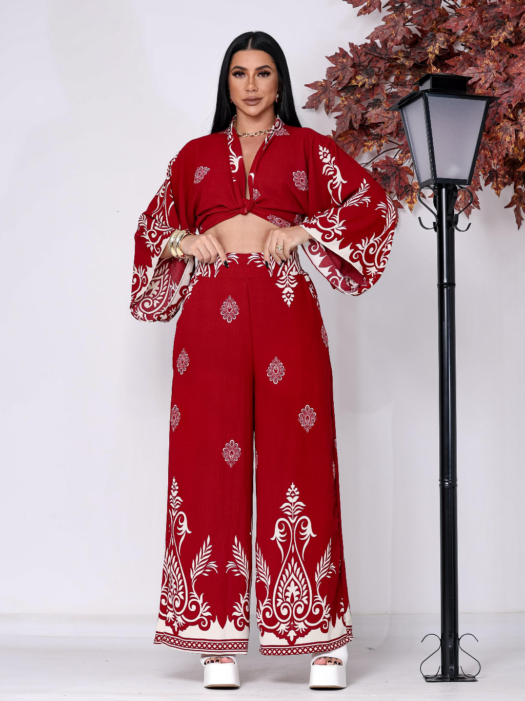Conjunto Feminino Estampado Barrado, Blusa Multiformas + Calça Pantalona Forrada com Elástico na Cintura tecido Duna