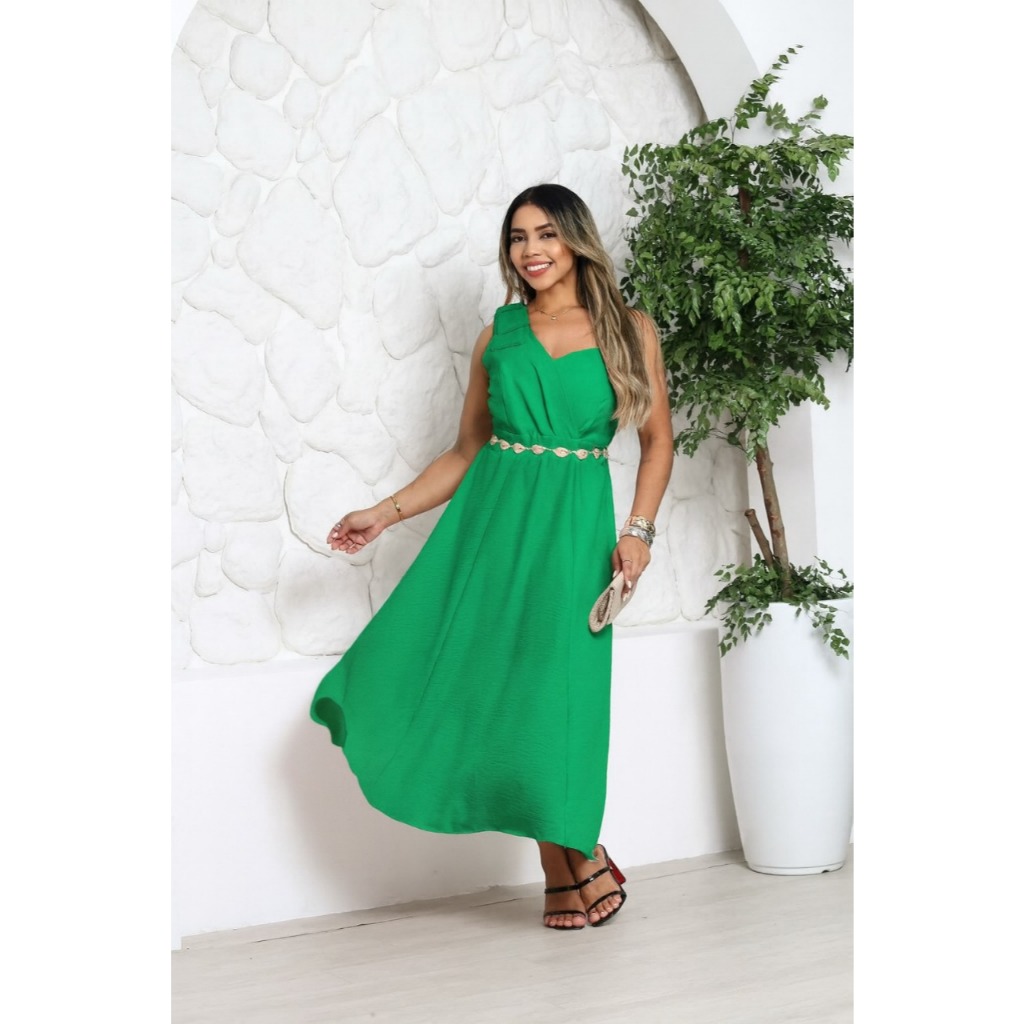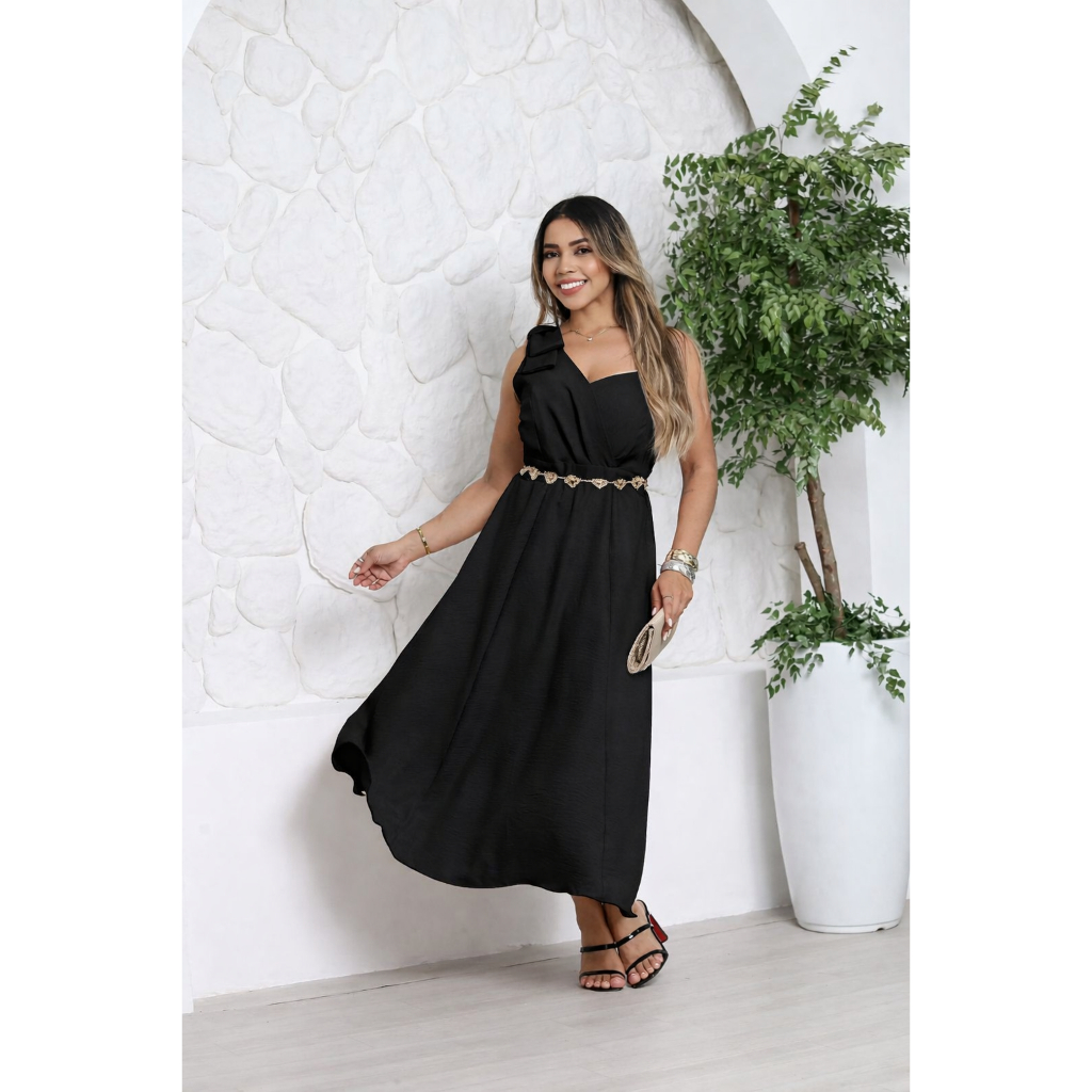 Vestido Feminino Mídi Laço no Ombro Tecido Duna Linho