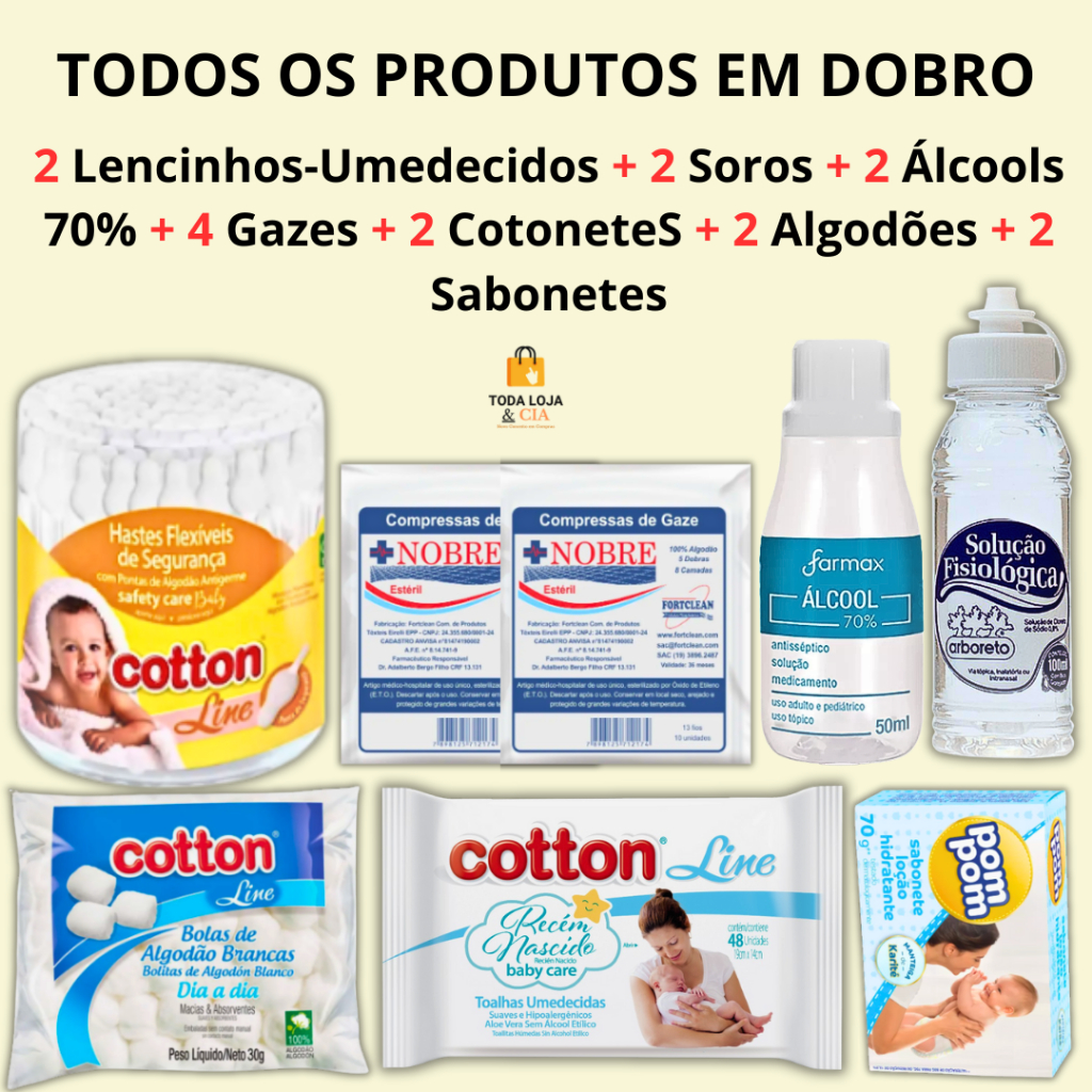 Kit Toalha Umedecida Higiene Bebê Recém-Nascido Kit C/ 8 Itens Cotonete+Soro+Gaze