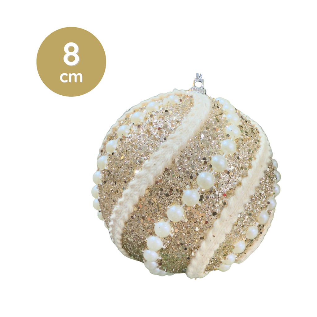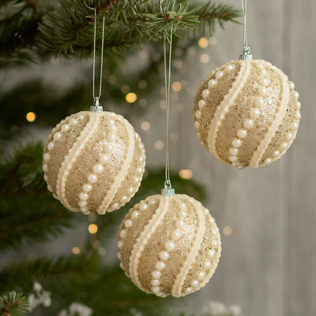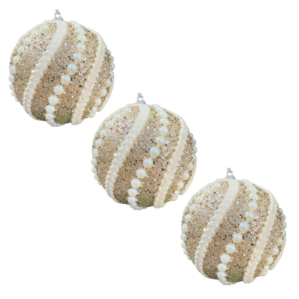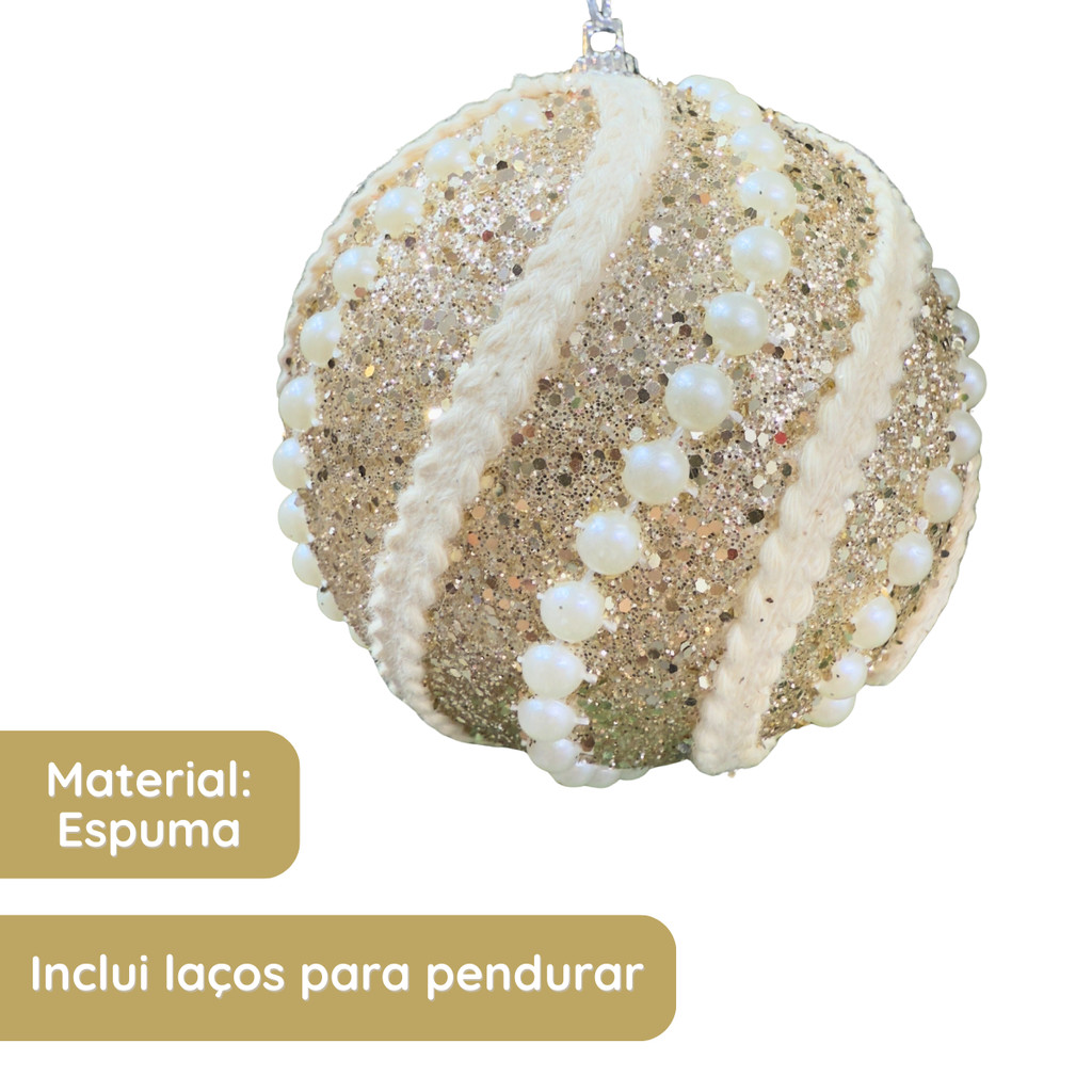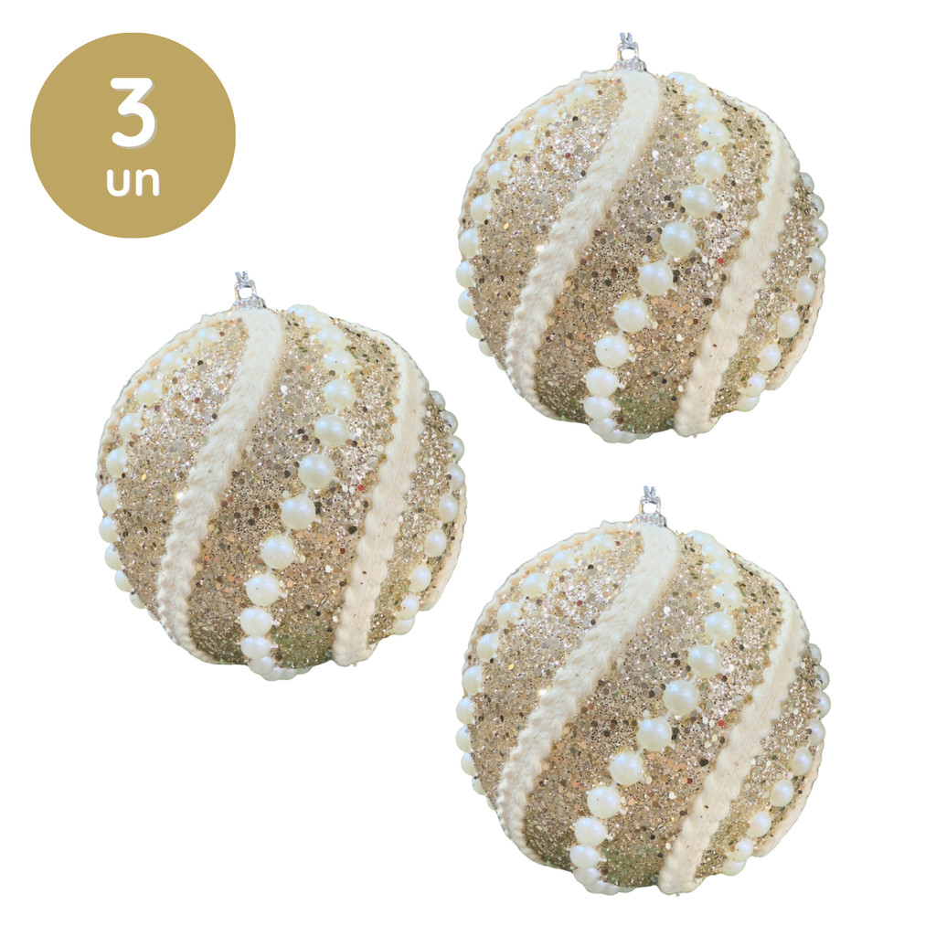 Kit 3 Bolas Natalinas Bege 8cm Decorativas Pérolas Glitter Natal Enfeite para Árvore de Natal