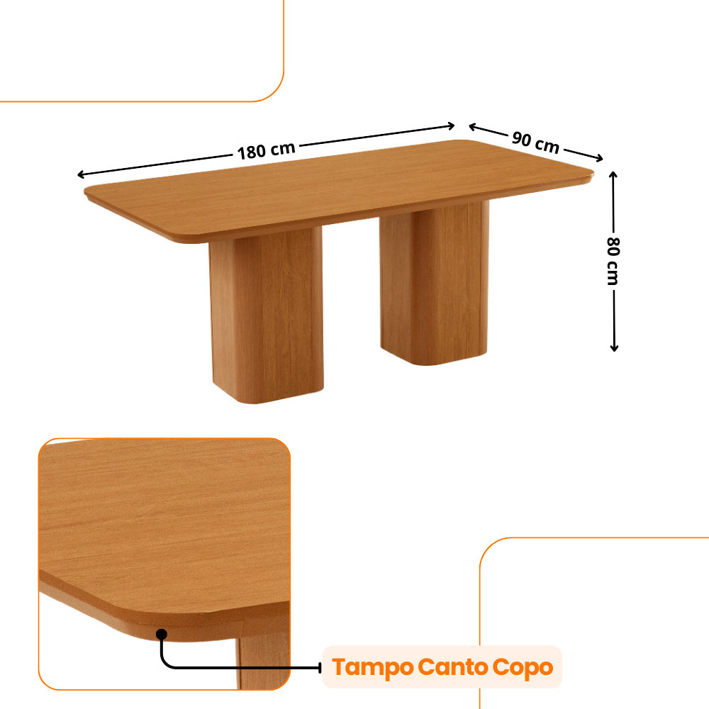 Mesa de Jantar Eloise 180cm Tampo Mdf Canto Copo Moderna Mobília