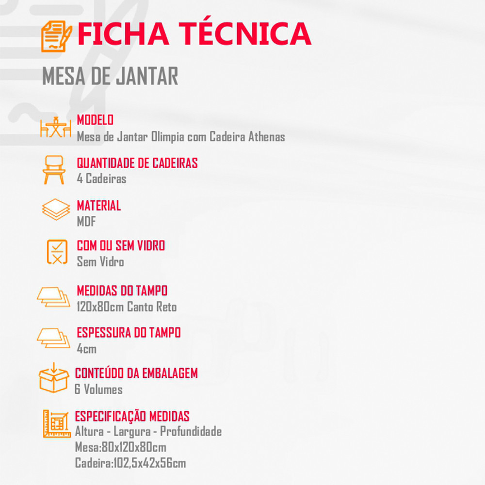 Conjunto Sala de Jantar Mesa Olímpia 120CM MDF Tampo Laminado Canto Reto com 4 Cadeiras Athenas