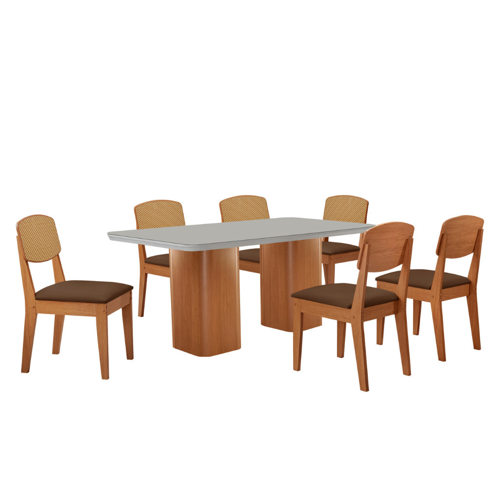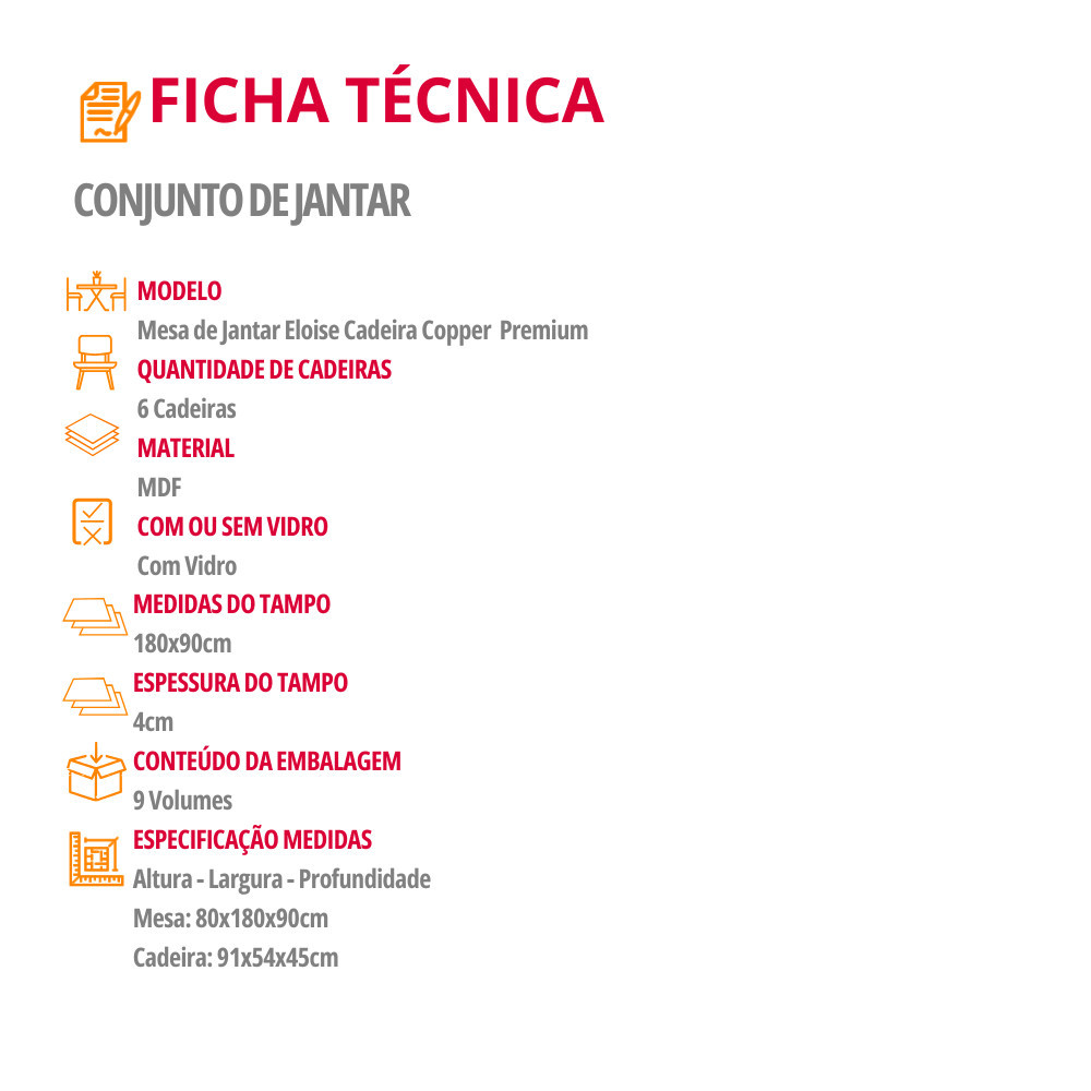Mesa de Jantar Eloise 180cm Tampo MDF Vidro com 6 Cadeiras Copper Premium Moderna Mobília